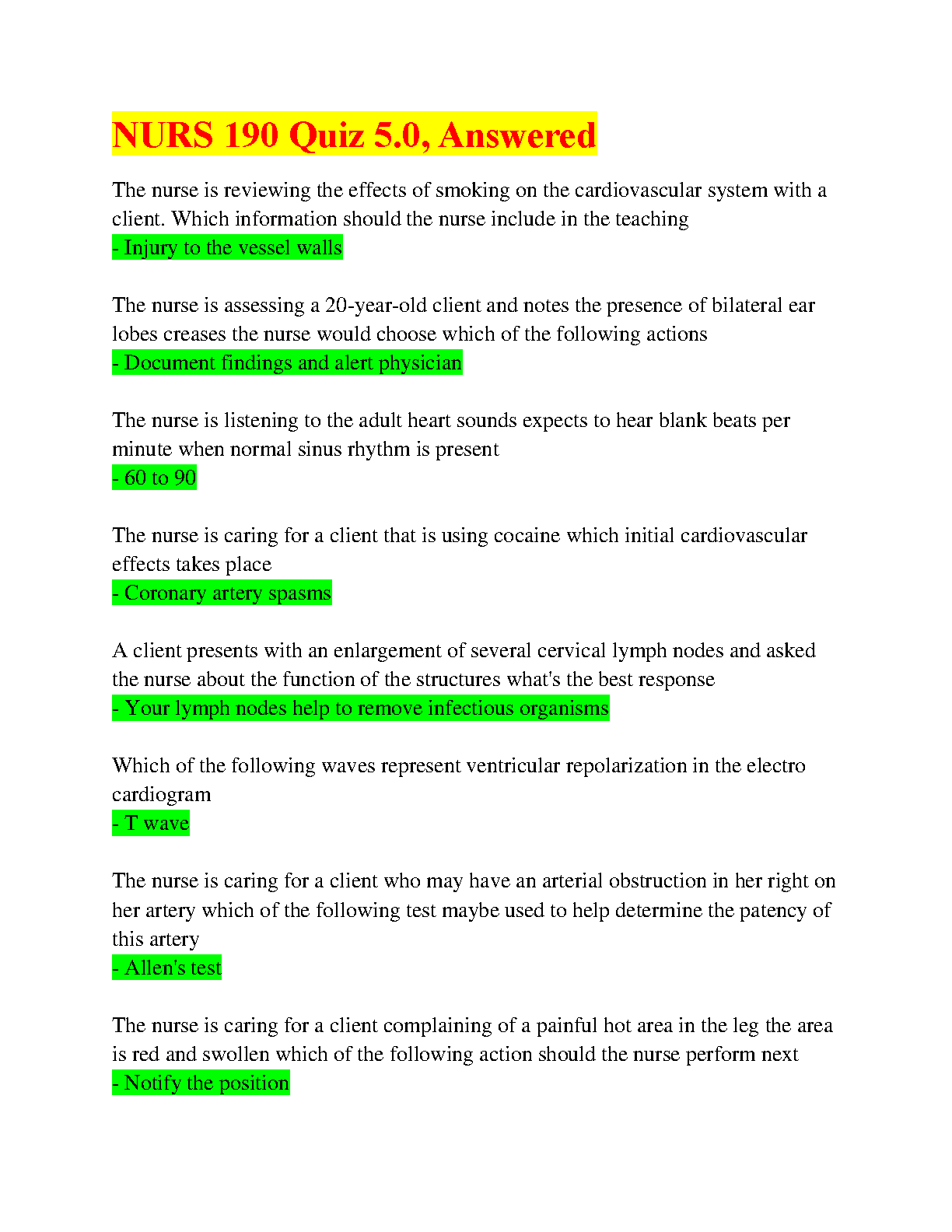NURS 190 Quiz 5.0, Answered - Latest Edition for Nursing Students