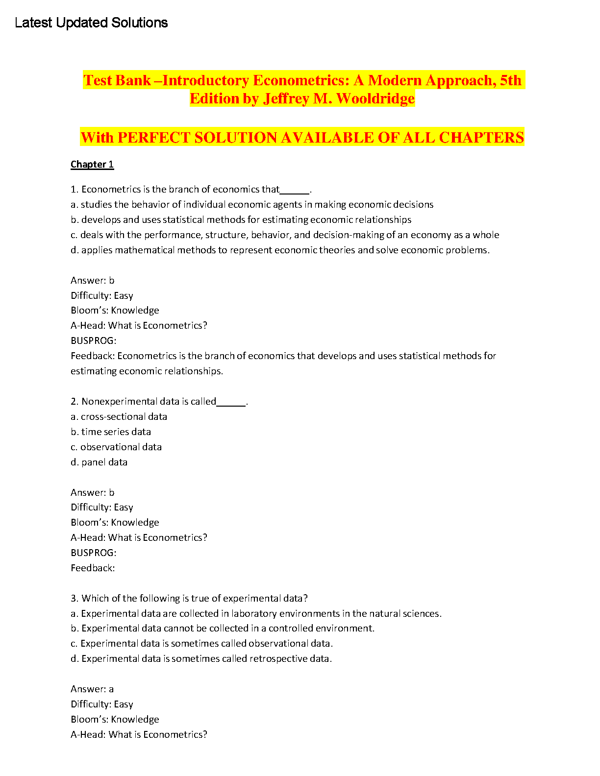 Get ahead of the curve with the "Introductory Econometrics: A Modern Approach, 5th Edition by Jeffrey M. Wooldridge" Test Bank, featuring complete solutions to all chapter problems. This resource can help you master the concepts, practice your skills, and ace your exams.