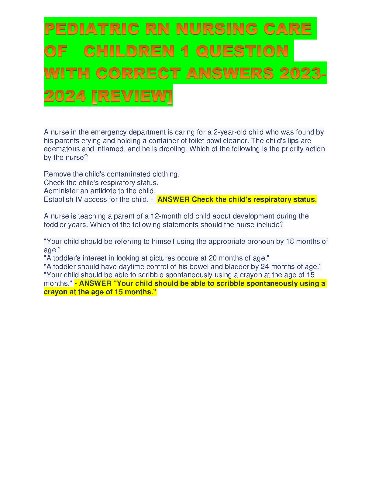 Pediatric RN Nursing Care of Children 1 Question with Correct Answers 2023-2024 Review - Edition 1 by Linda Anne Silvestri, RN, MSN, and Carolyn M. Noga, RN, MSN, PHN