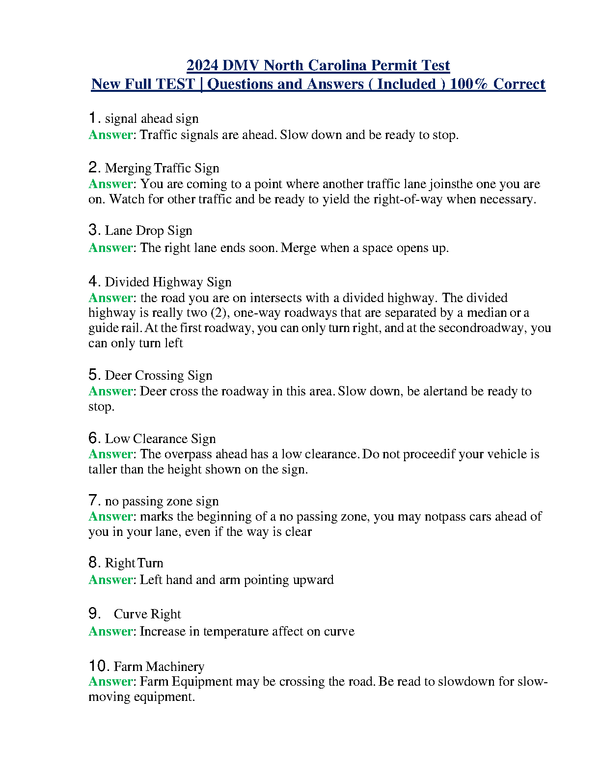 2024 DMV North Carolina Permit Test Questions and Answers (Included) 100% Correct
