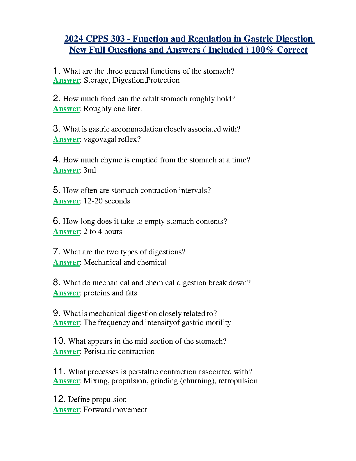 2024 CPPS 303 - Function and Regulation in Gastric Digestion New Full Questions and Answers ( Included ) 100% Correct
