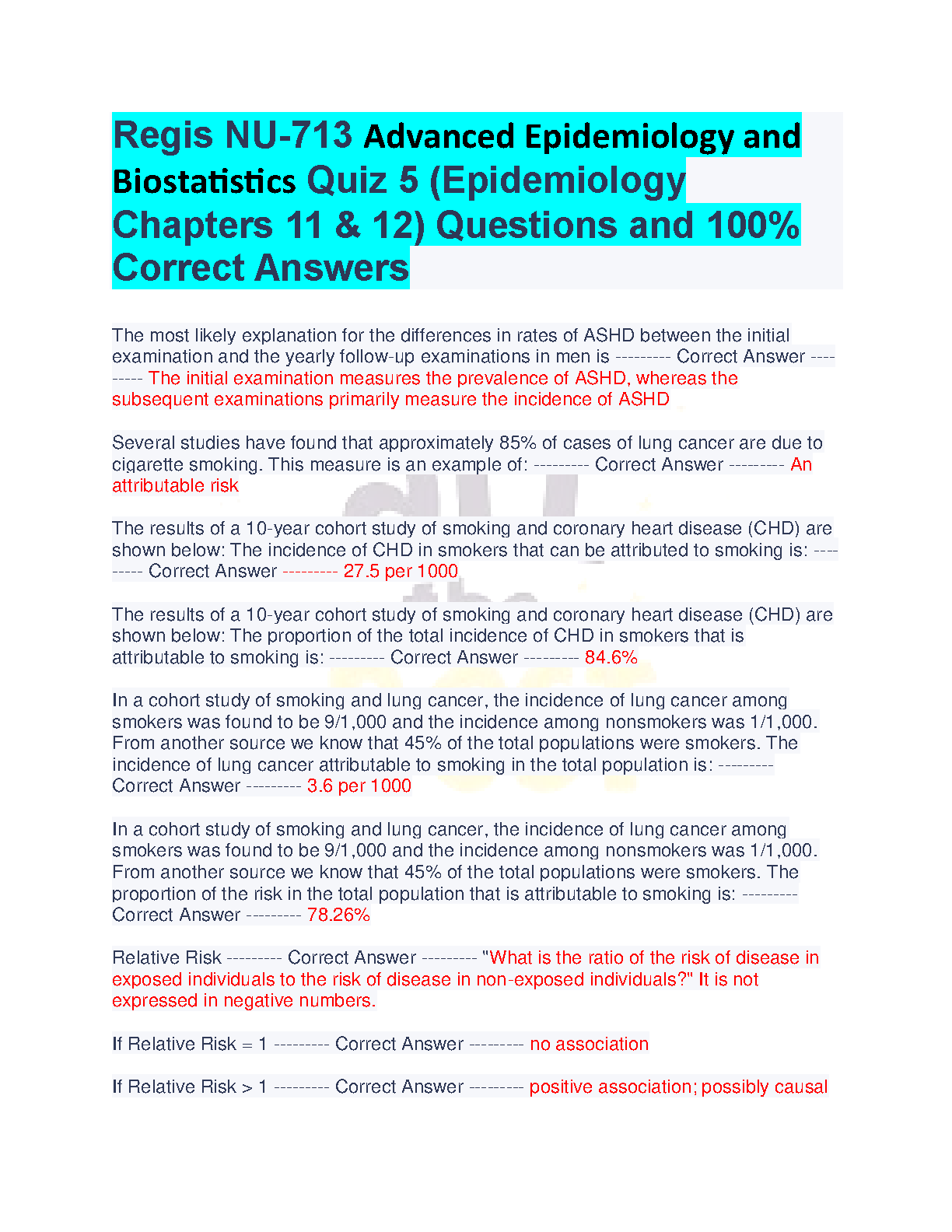 Ace your Regis NU-713 Advanced Epidemiology and Biostatistics Quiz 5 exam with these 100% accurate answers. This comprehensive study guide covers Chapters 11 & 12 and provides all the solutions you need to achieve a top score on your first attempt. Don't risk a resit; use these expertly crafted answers to boost your confidence and secure a great result.