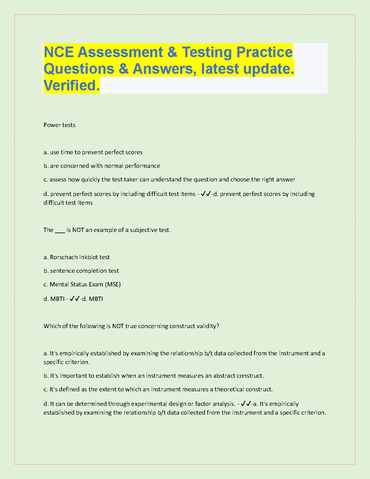 NCE Assessment & Testing Practice Questions and Answers: Latest Update, Verified