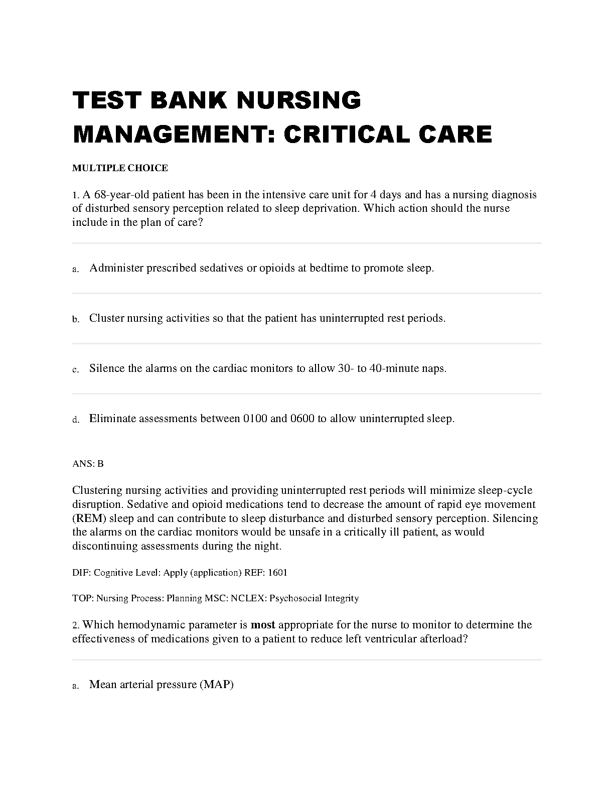 Test Bank Nursing Management: Critical Care - Latest Edition - Mastering the Essentials for Exam Success in 2024/2025