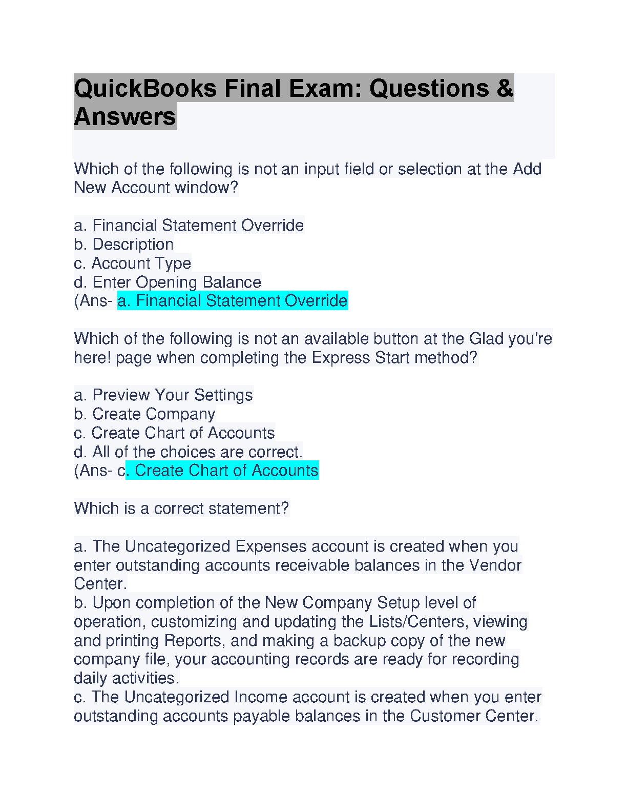 QuickBooks Final Exam: Questions & Answers for Students - Mastering QuickBooks for Success in 2024/2025