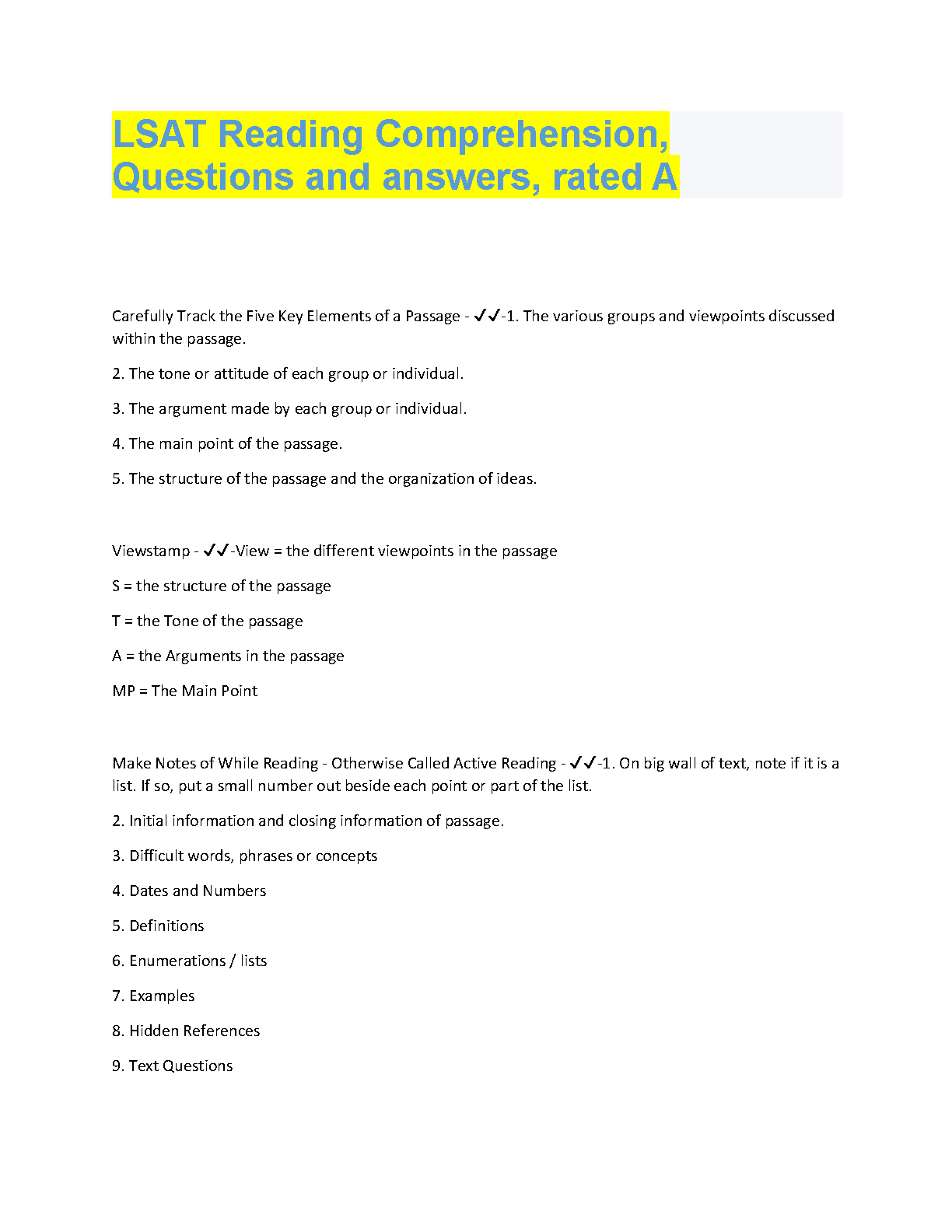 LSAT Reading Comprehension Questions and Answers is a comprehensive guide that will help you ace the LSAT Reading Comprehension section. The guide covers all the key elements of a passage, including the tone and attitude of each group or individual, the argument made by each group or individual, the main point of the passage, and the structure of the passage and the organization of ideas.