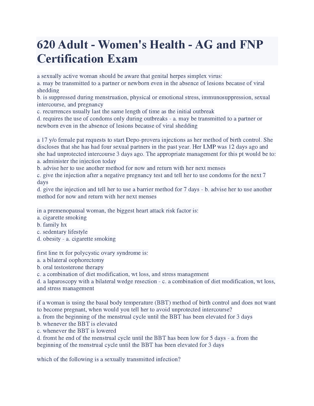 620 Adult - Women's Health - AG and FNP Certification Exam - 2024/2025 Edition - Pass on the First Attempt