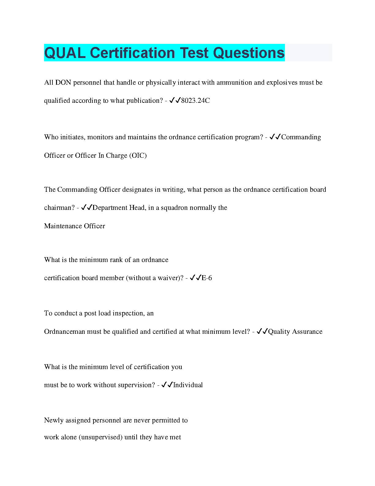 Ace your QUAL certification exam with this comprehensive set of practice questions. Test your knowledge on topics like handling explosives, ordnance certification procedures, and minimum qualification requirements.