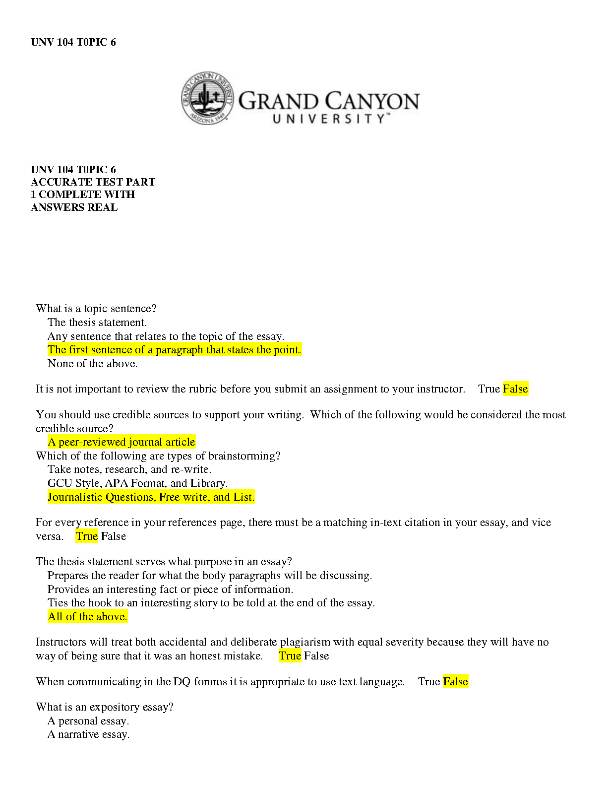 This comprehensive test bank for UNV 104 Topic 6 at Grand Canyon University includes a collection of real practice questions designed to help students master the material and pass their exams on the first attempt. These accurate test questions cover key concepts like credible sources, topic sentences, thesis statements, plagiarism, and expository essays.