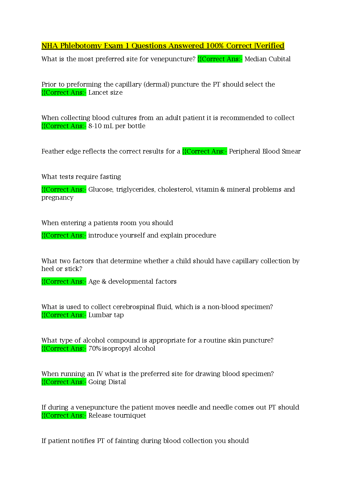NHA Phlebotomy Exam 1 Questions Answered 100% Correct - Verified - 2024 Edition: Pass on First Attempt, No Resits!