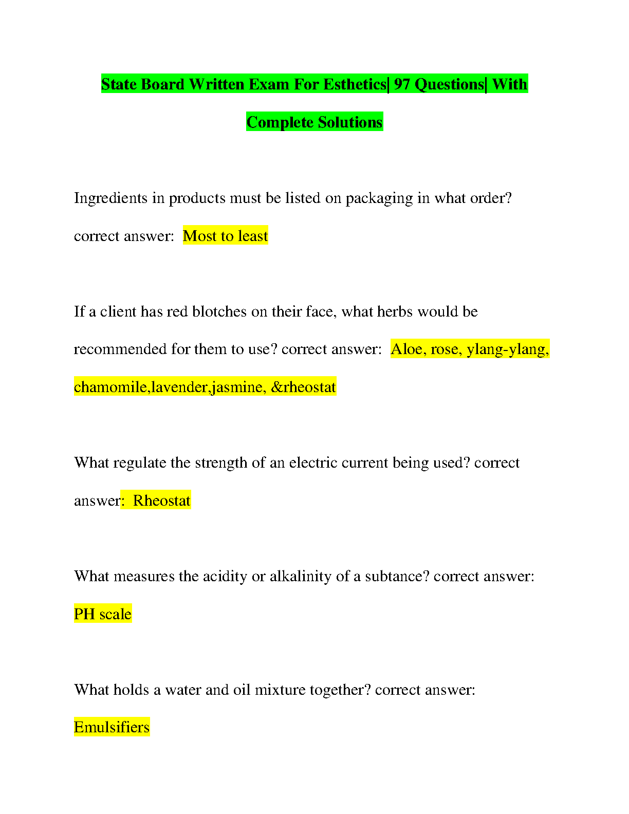 Ace your State Board Written Exam for Esthetics with this comprehensive study guide featuring 97 practice questions and complete solutions. Gain confidence and pass your exam on the first attempt.