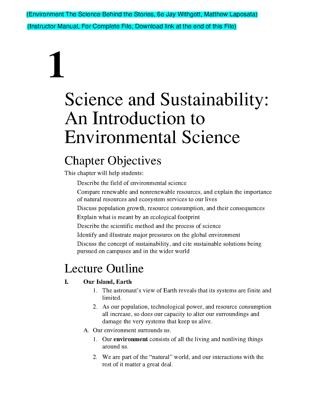This is a chapter from the 6th edition of the popular textbook, "Environmental Science" by Jay Withgott and Matthew Laposata. It provides a comprehensive introduction to environmental science and explores its key concepts. This chapter covers topics such as the field of environmental science, renewable and nonrenewable resources, population growth, resource consumption, the scientific method, and the concept of sustainability.