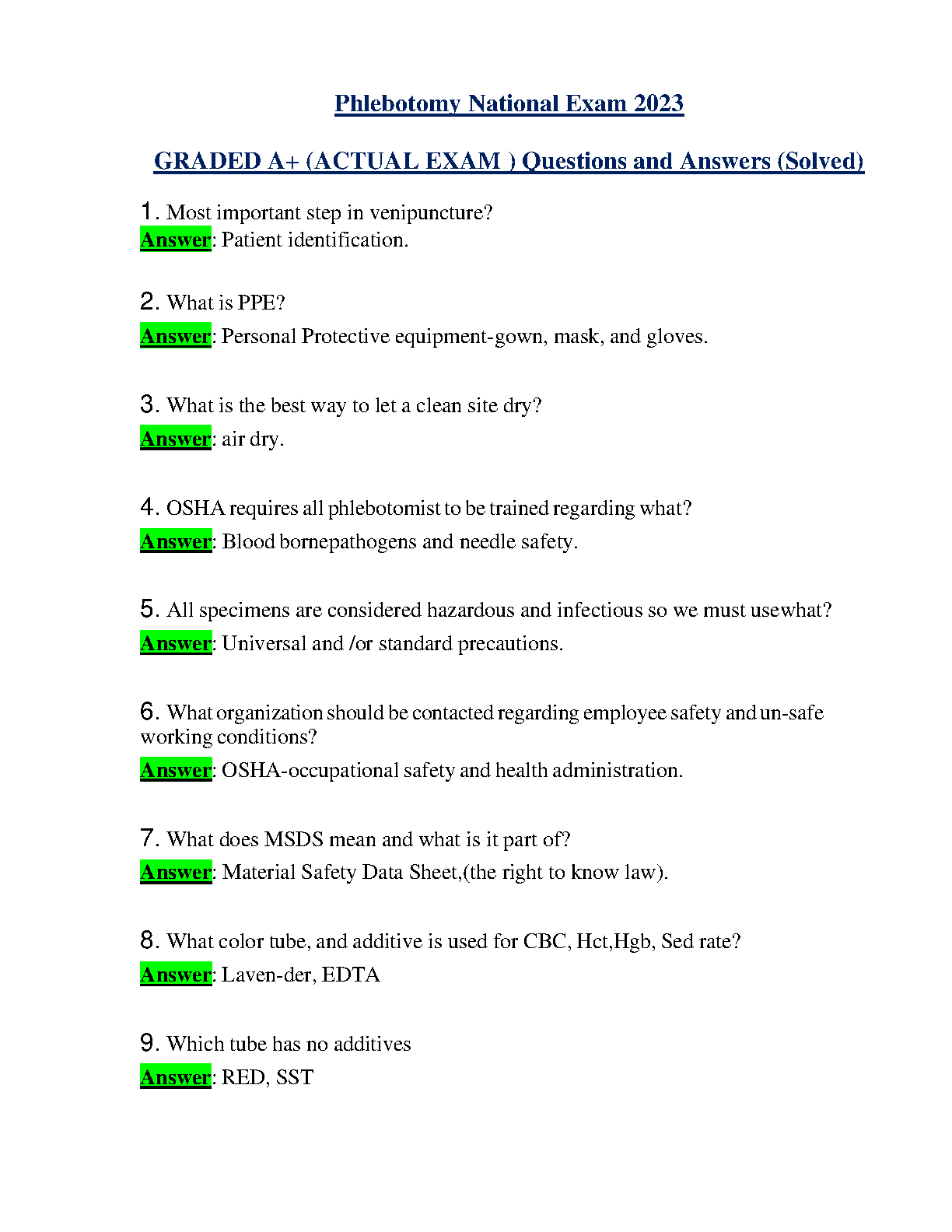 Phlebotomy National Exam 2023 - Graded A+ (Actual Exam) is a comprehensive practice exam that covers all the essential topics, such as patient identification, PPE, clean site drying, OSHA regulations, bloodborne pathogens, universal precautions, MSDS, and more. This practice exam is a perfect resource to help you pass the Phlebotomy National Exam on your first attempt.
