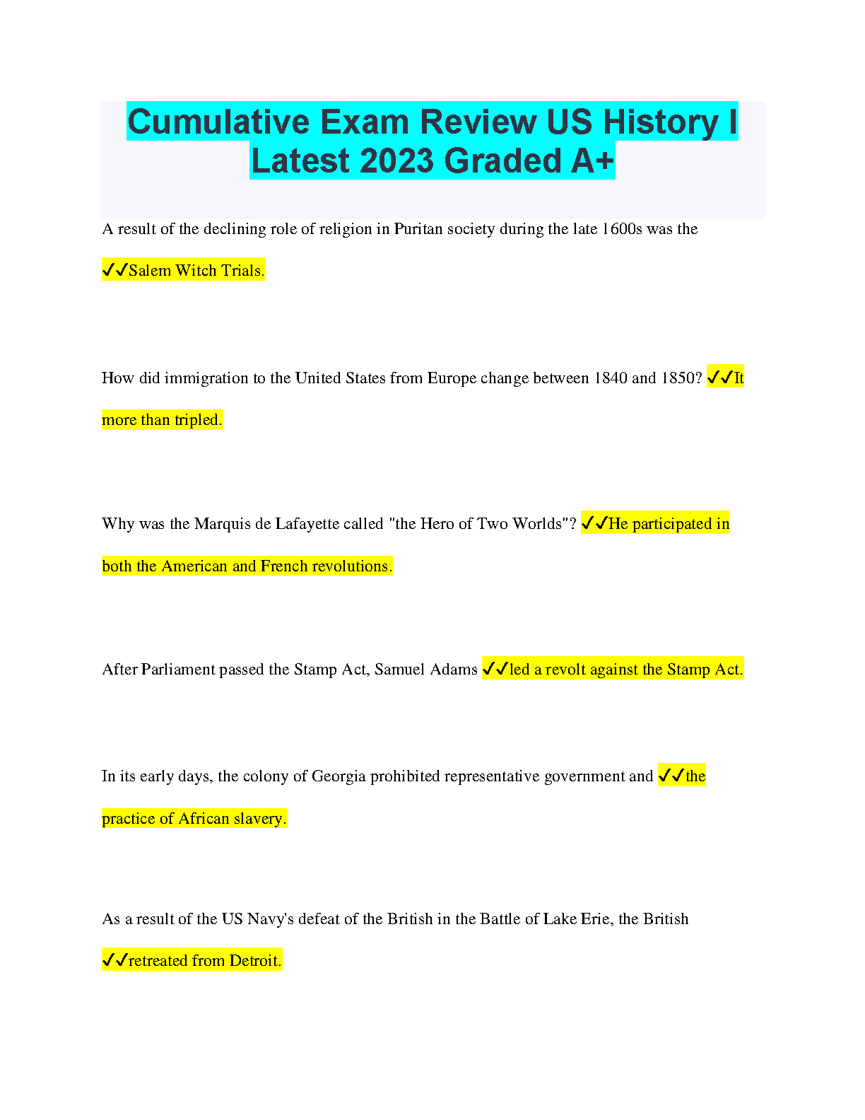 US History I Cumulative Exam Review Latest 2023 Graded A+ - By Alan Brinkley, David Shi, and T.H. Breen