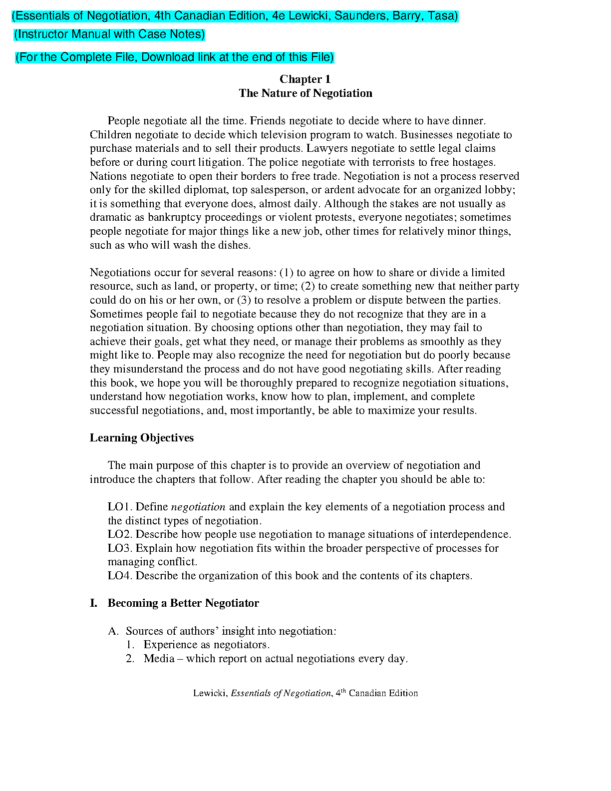 This comprehensive guide, Essentials of Negotiation, 4th Canadian Edition, by renowned authors Lewicki, Saunders, Barry, and Tasa, equips students with the essential negotiation skills and strategies to achieve success in today's competitive world. Through its clear explanations, practical examples, and real-world case studies, this resource will empower students to confidently navigate complex negotiations and achieve their desired outcomes. This book is perfect for students looking to ace their exams on the first attempt and avoid resits.