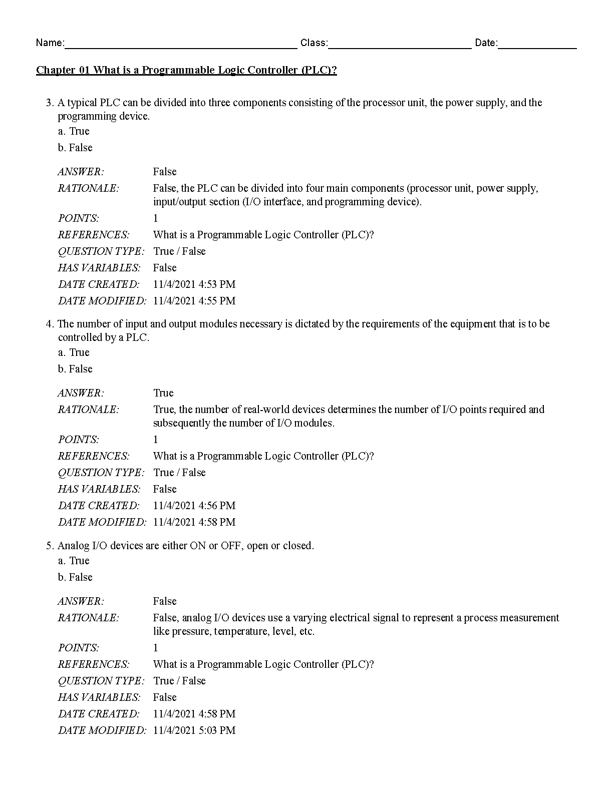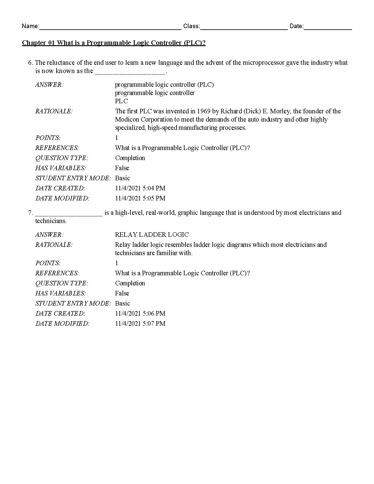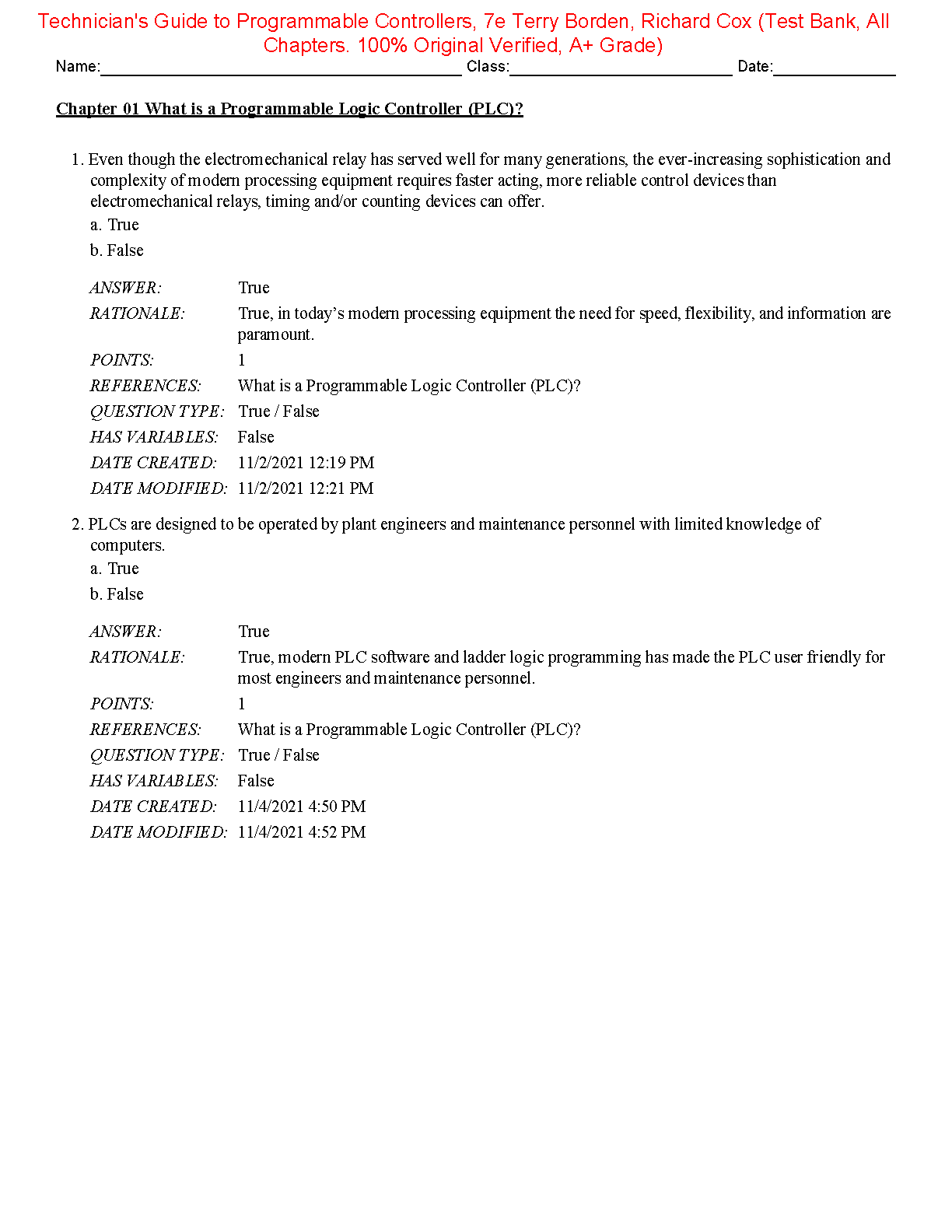 Technician's Guide to Programmable Controllers, 7e Terry Borden, Richard Cox (Test Bank, All Chapters, 100% Original Verified, A+ Grade)