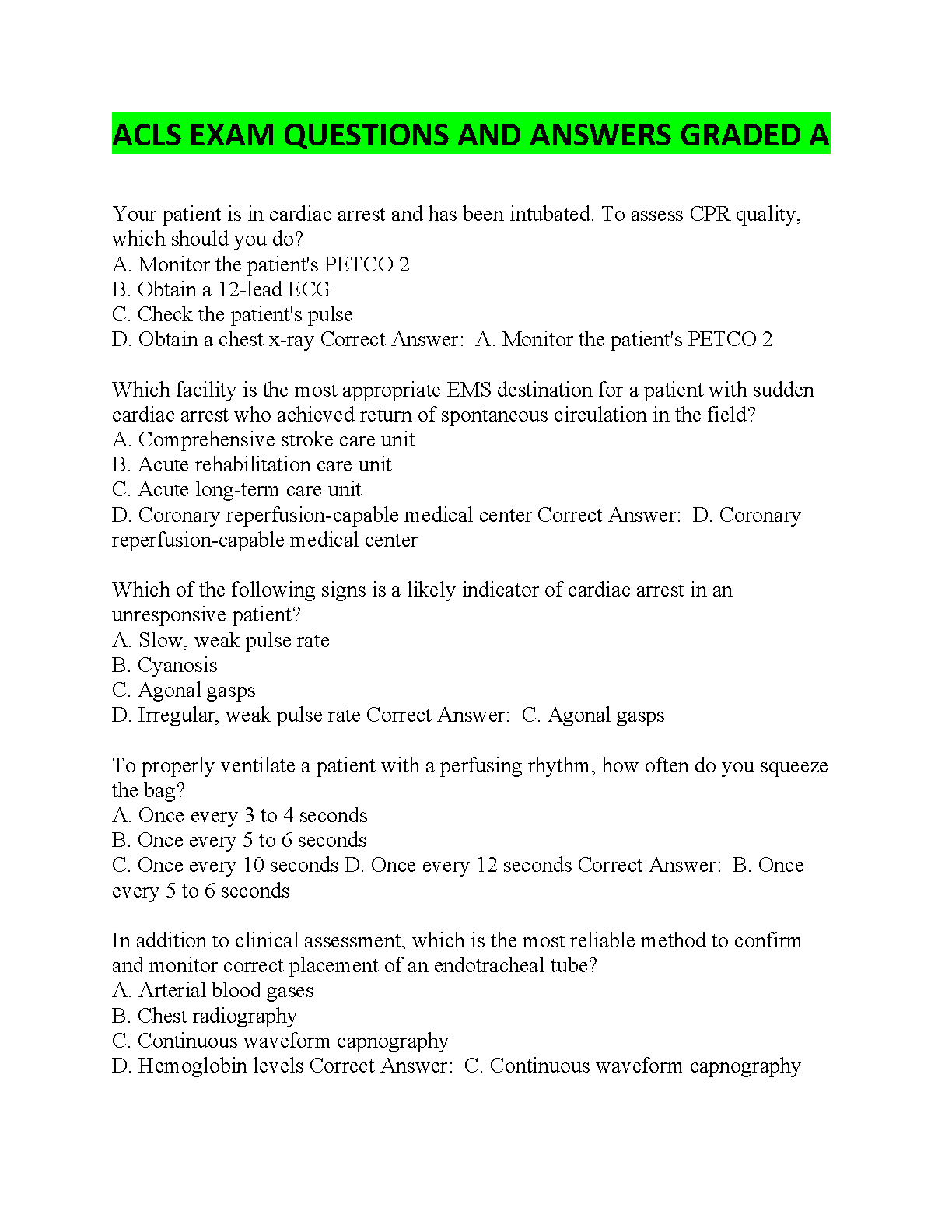 ACLS EXAM QUESTIONS AND ANSWERS GRADED A