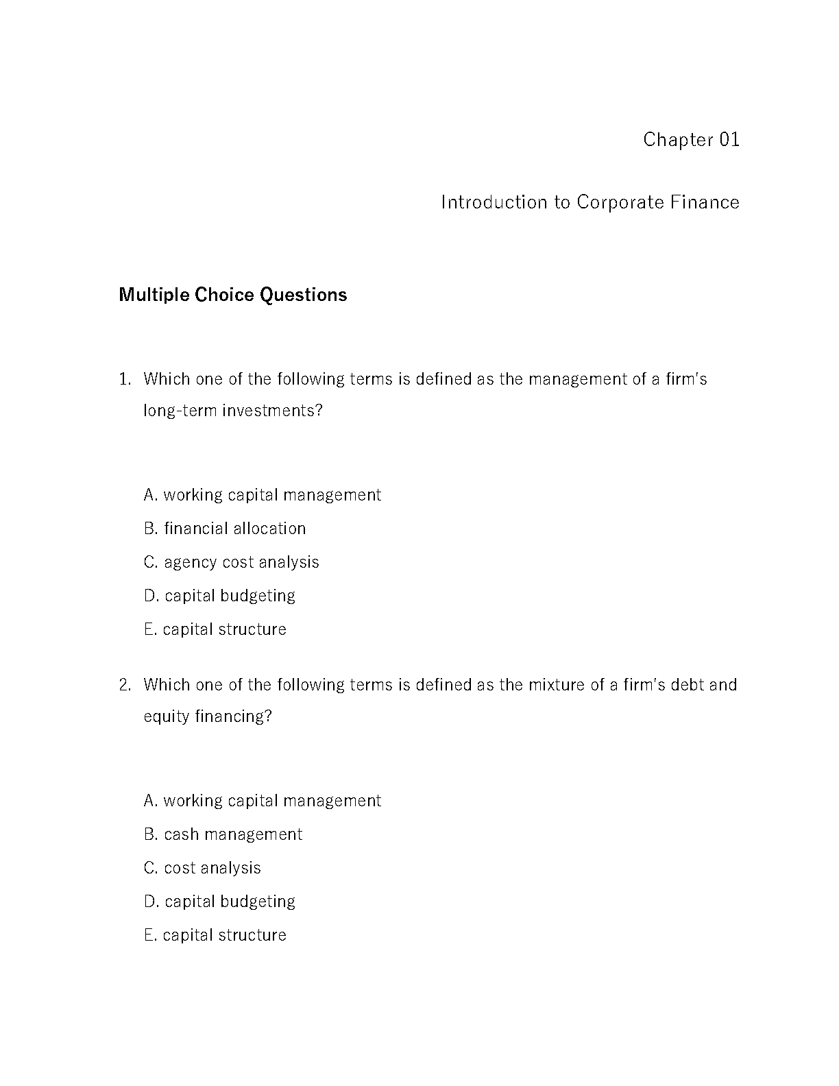 This resource provides a set of multiple-choice questions for Chapter 01 of the book "Corporate Finance" by Ross, Westerfield, Jordan, and Jaffe. It's an ideal study aid for students seeking a solid understanding of core financial concepts and preparing for exams.