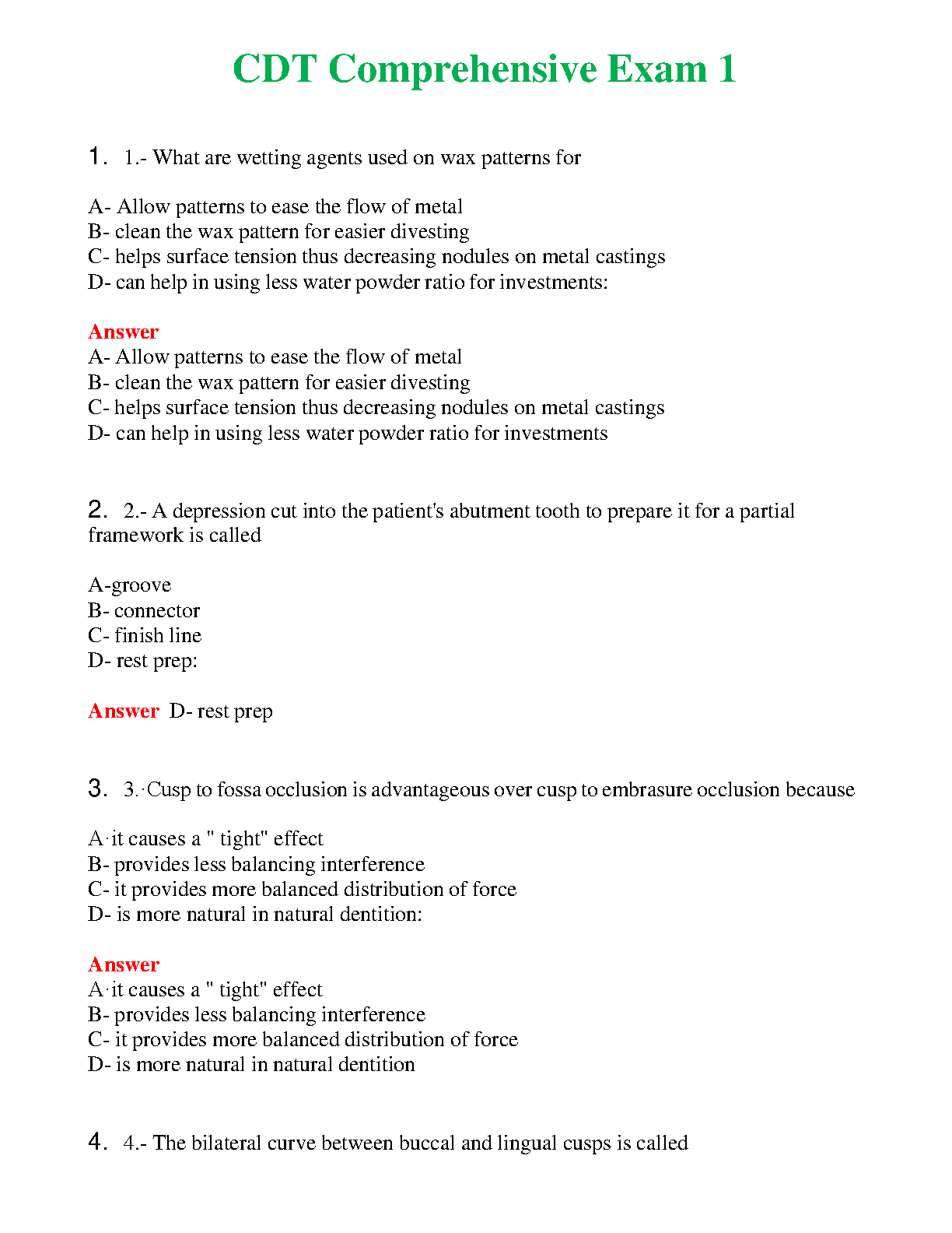 Comprehensive Exam 1 Questions and Answers for the CDT (Certified Dental Technician) certification. This resource includes a comprehensive overview of the CDT exam content covering various topics such as wetting agents used on wax patterns, understanding dental anatomy, and understanding the principles of occlusion. The file is organized by question and answer for easy reference and understanding. It is an invaluable study tool for students preparing for the CDT exam.