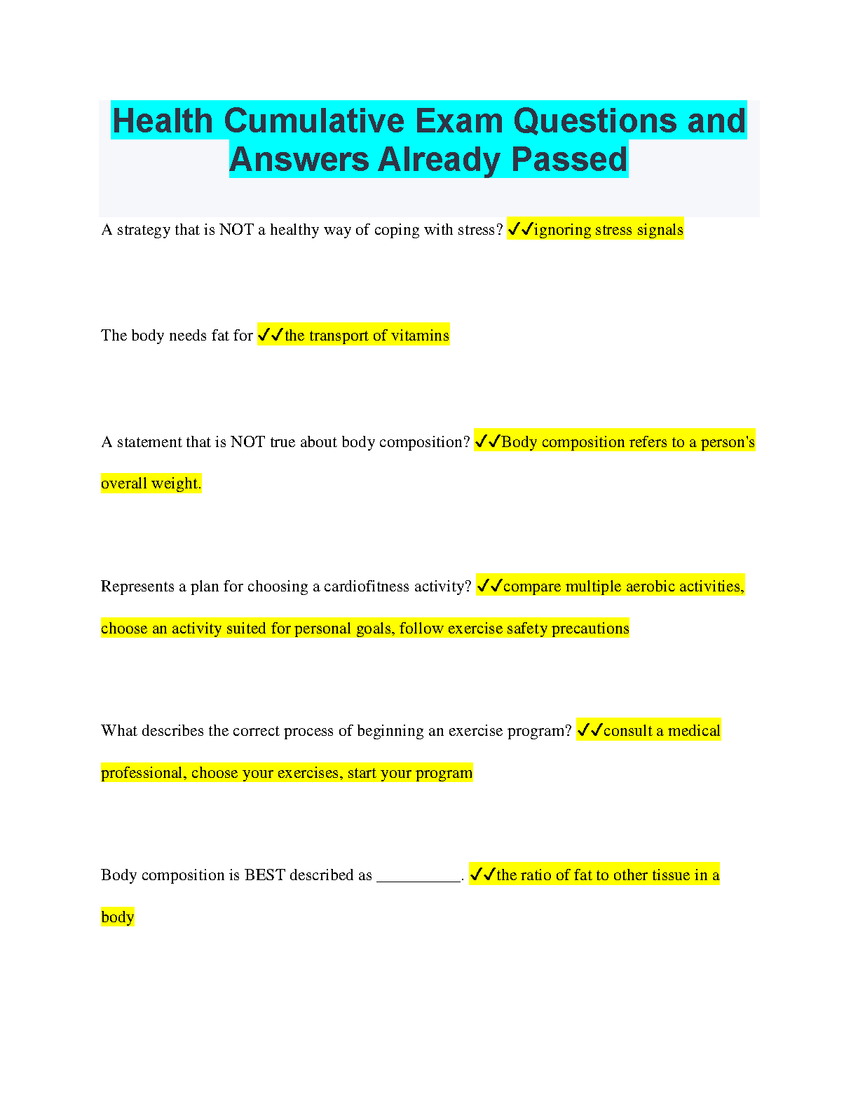 Health Cumulative Exam Questions and Answers Already Passed - 2024/2025 Edition - Ace Your Exams with These Helpful Resources
