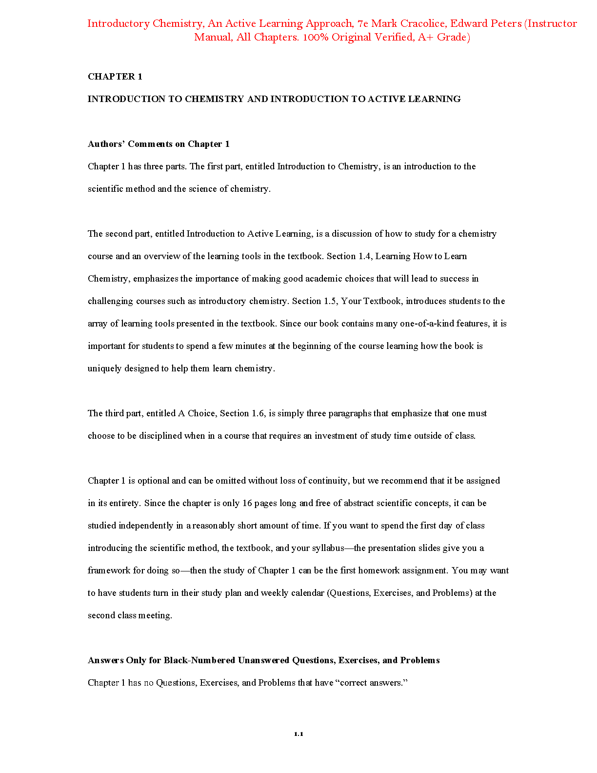 This file is a valuable resource for students enrolled in introductory chemistry courses using the textbook "Introductory Chemistry: An Active Learning Approach" by Mark Cracolice and Edward Peters. It provides a comprehensive introduction to the key concepts of the first chapter, covering the scientific method, active learning strategies, and the importance of making informed academic choices.