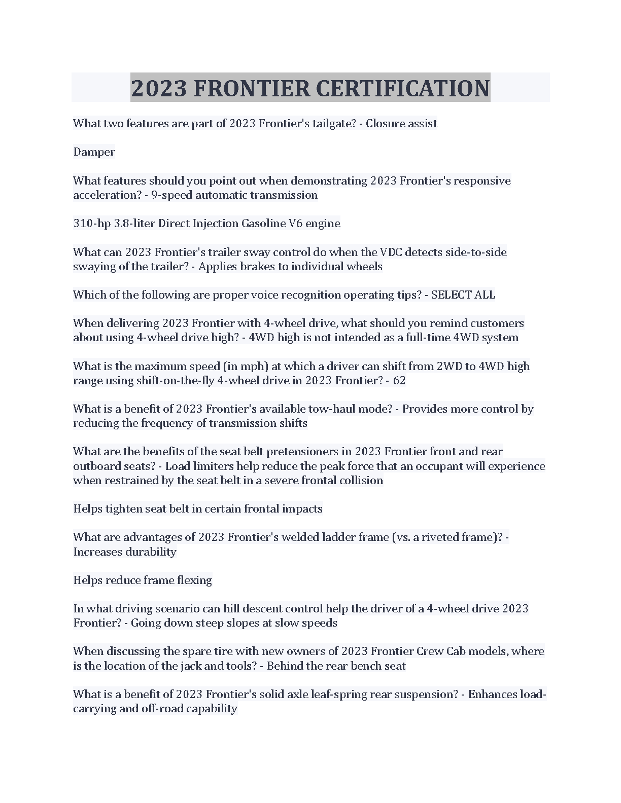 This comprehensive study guide provides you with a complete overview of the key features and specifications of the 2023 Nissan Frontier. Master the essential information required for your exams and gain confidence for success on your first try.
