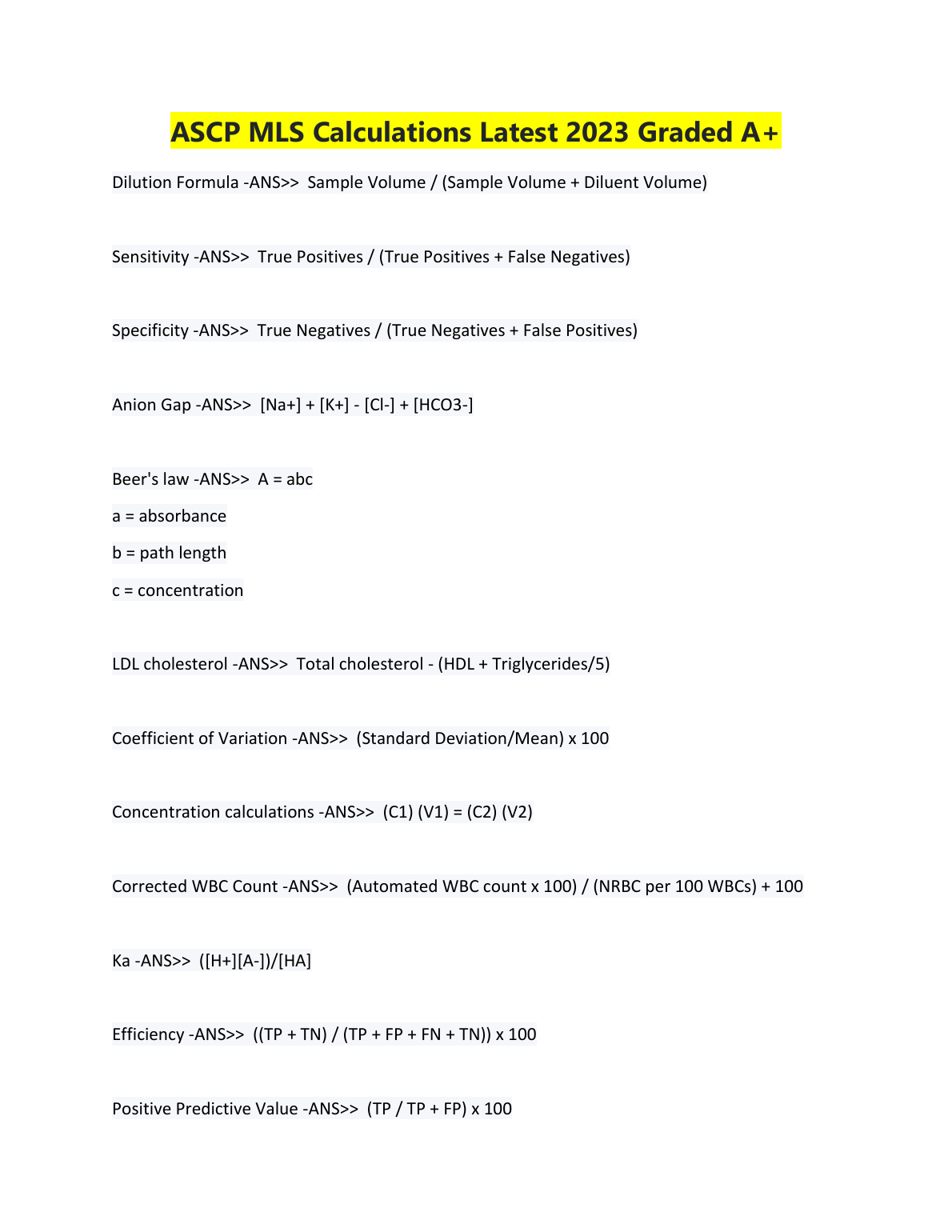 ASCP MLS Calculations Latest 2023 Graded A+ LASTEST SOLUTION. DOWNLOAD on www.hackedexams.com INSTANTLY.