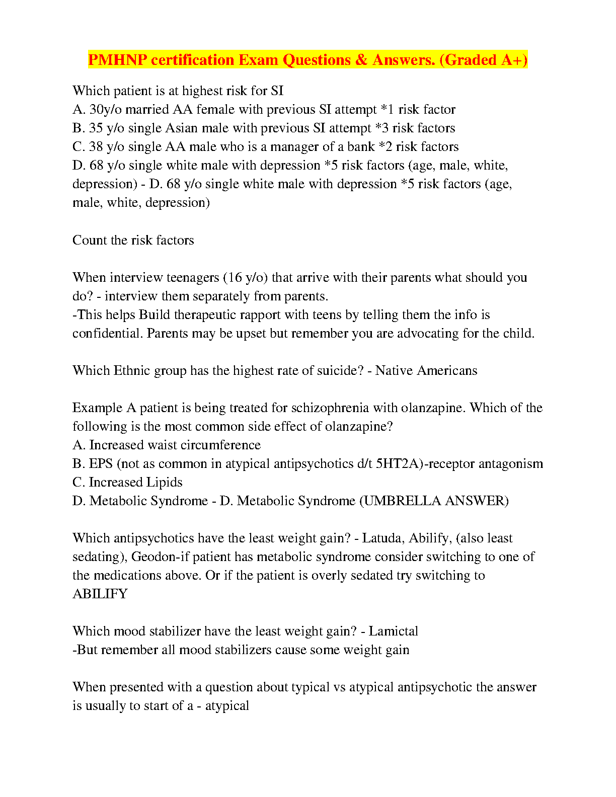 This comprehensive study guide provides a collection of PMHNP Certification Exam Questions & Answers, meticulously crafted to help you ace your exam on the first attempt. This resource covers essential topics in Psychiatric Mental Health Nursing and is designed to enhance your understanding and boost your confidence. It is a must-have for aspiring PMHNPs and ensures you are well-prepared for your certification journey.