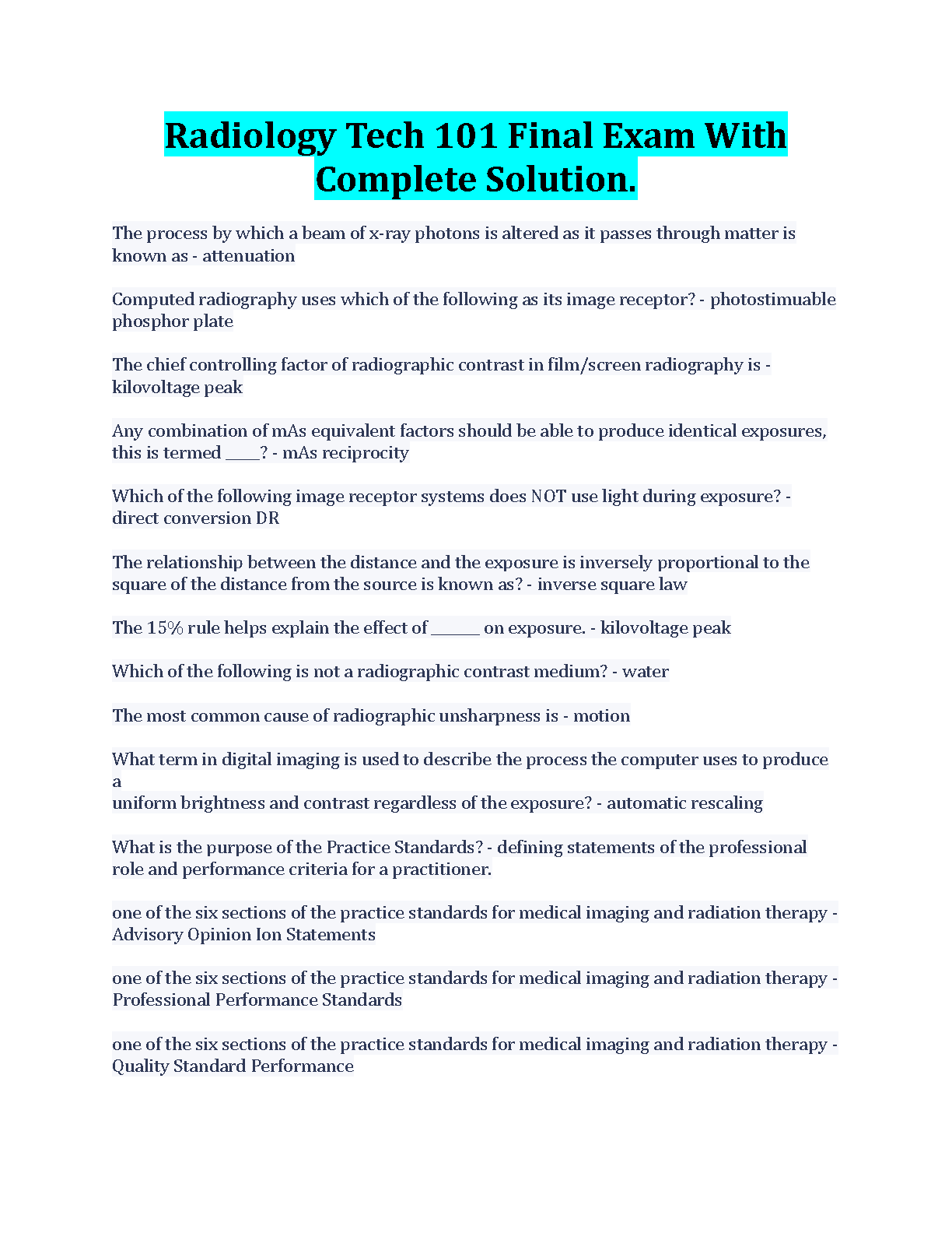 Get ready to ace your Radiology Tech 101 final exam with this comprehensive study guide. This guide includes a complete set of practice questions and detailed solutions that will help you understand key concepts and prepare for your exam. The questions cover a wide range of topics, including attenuation, photostimulable phosphor plate, kilovoltage peak, mAs reciprocity, direct conversion DR, inverse square law, radiographic contrast medium, radiographic unsharpness, automatic rescaling, and practice standards.
