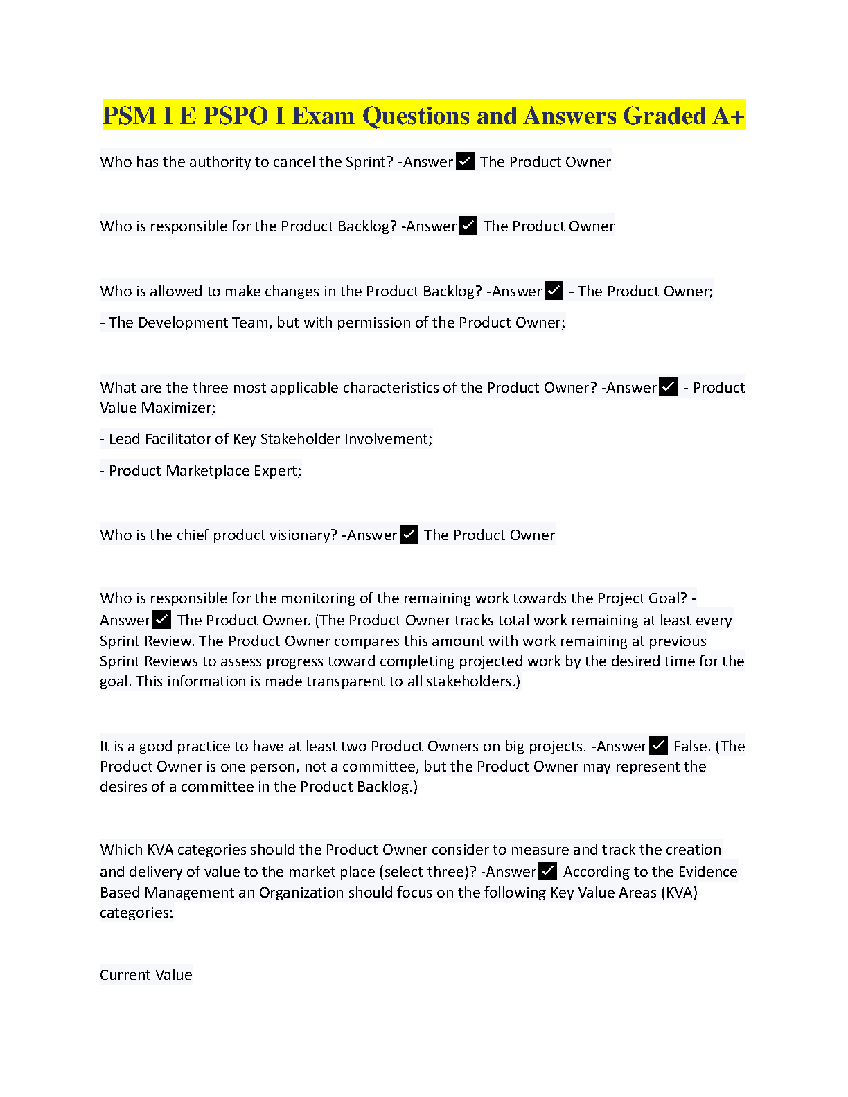 Get ready to ace your PSM I & PSPO I exam with this comprehensive study guide. All questions are answered and graded A+ for an easier first attempt. This resource will help you master the essential concepts and prepare for your exam.