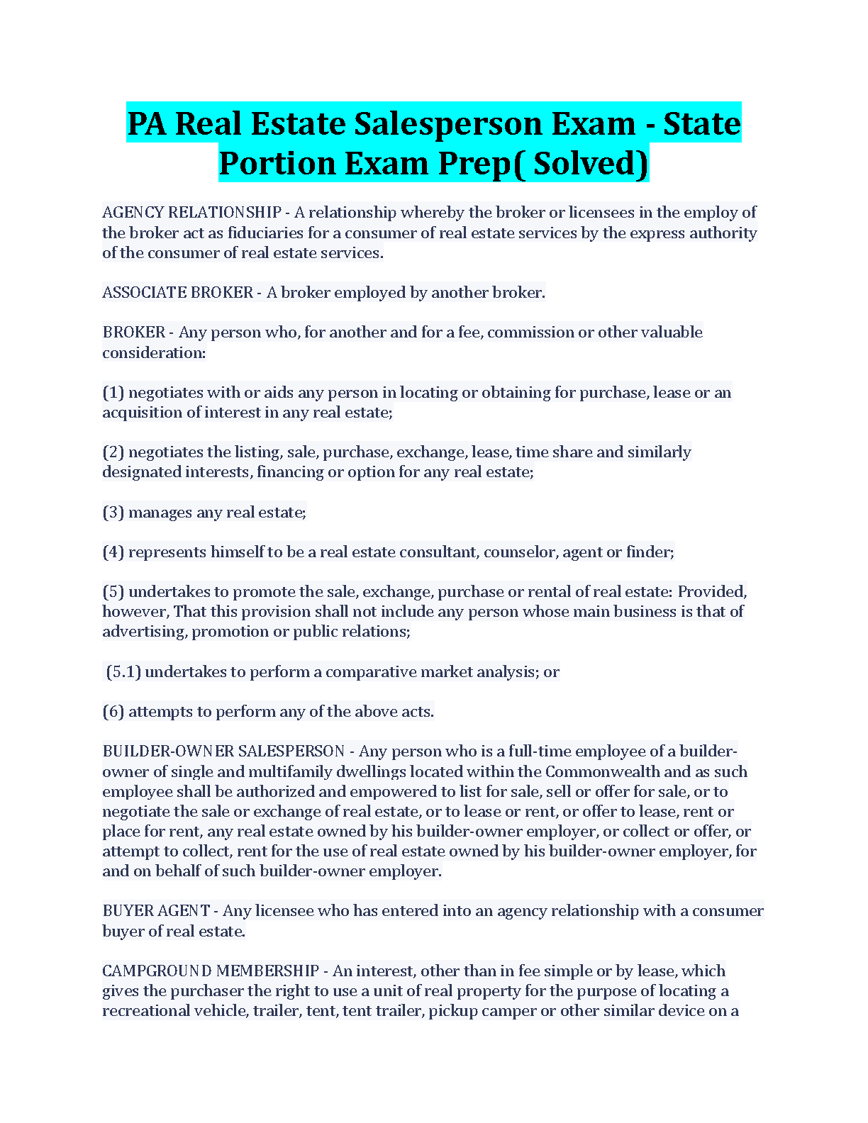 PA Real Estate Salesperson Exam - State Portion Exam Prep(Solved) 2024-2025 Edition - Pass on Your First Attempt & Avoid Resits