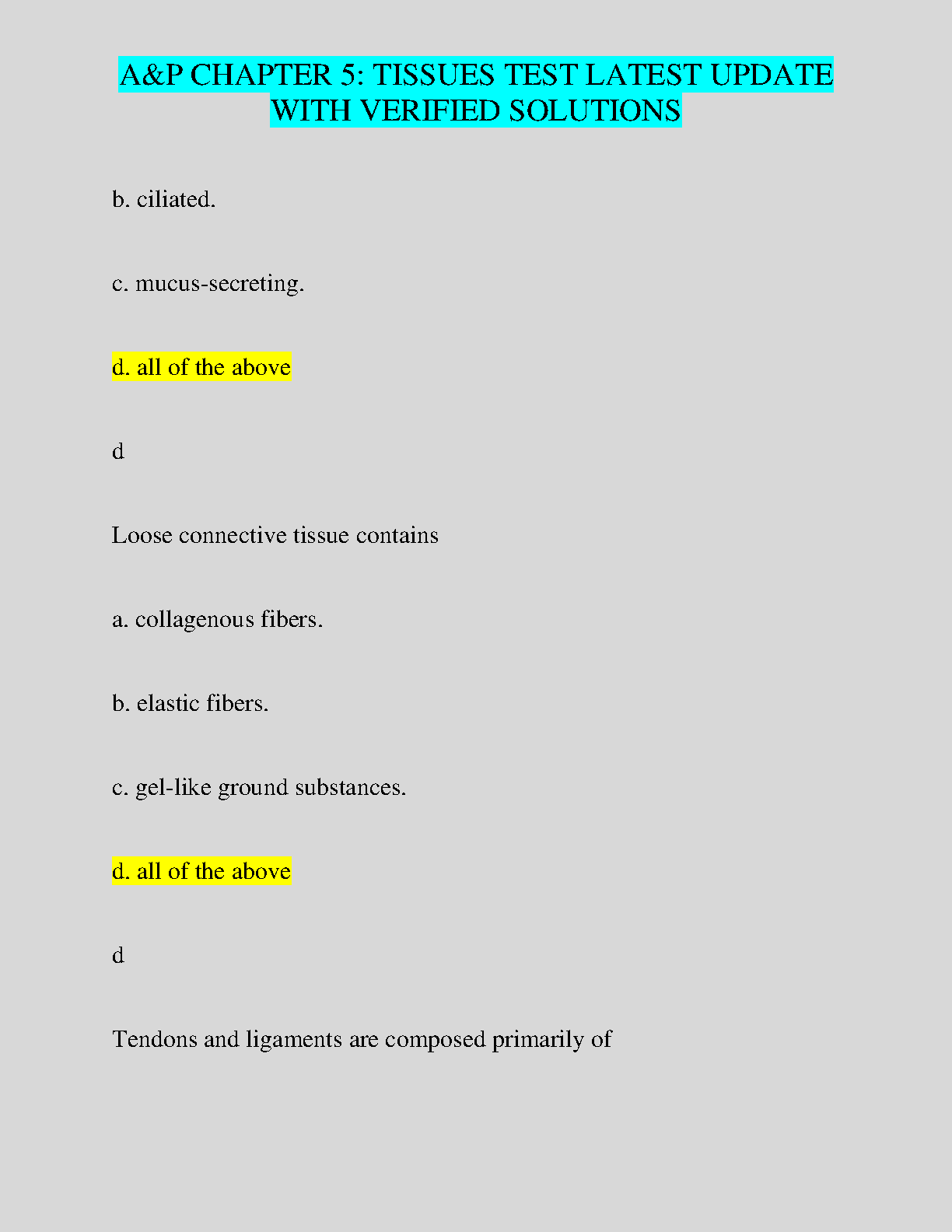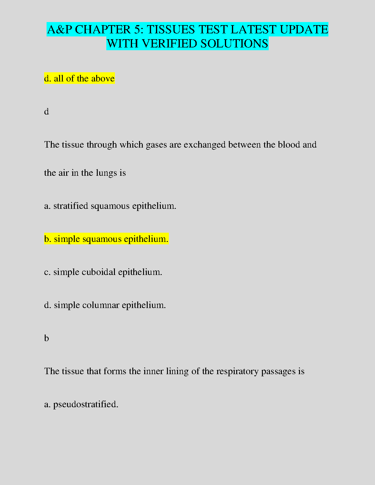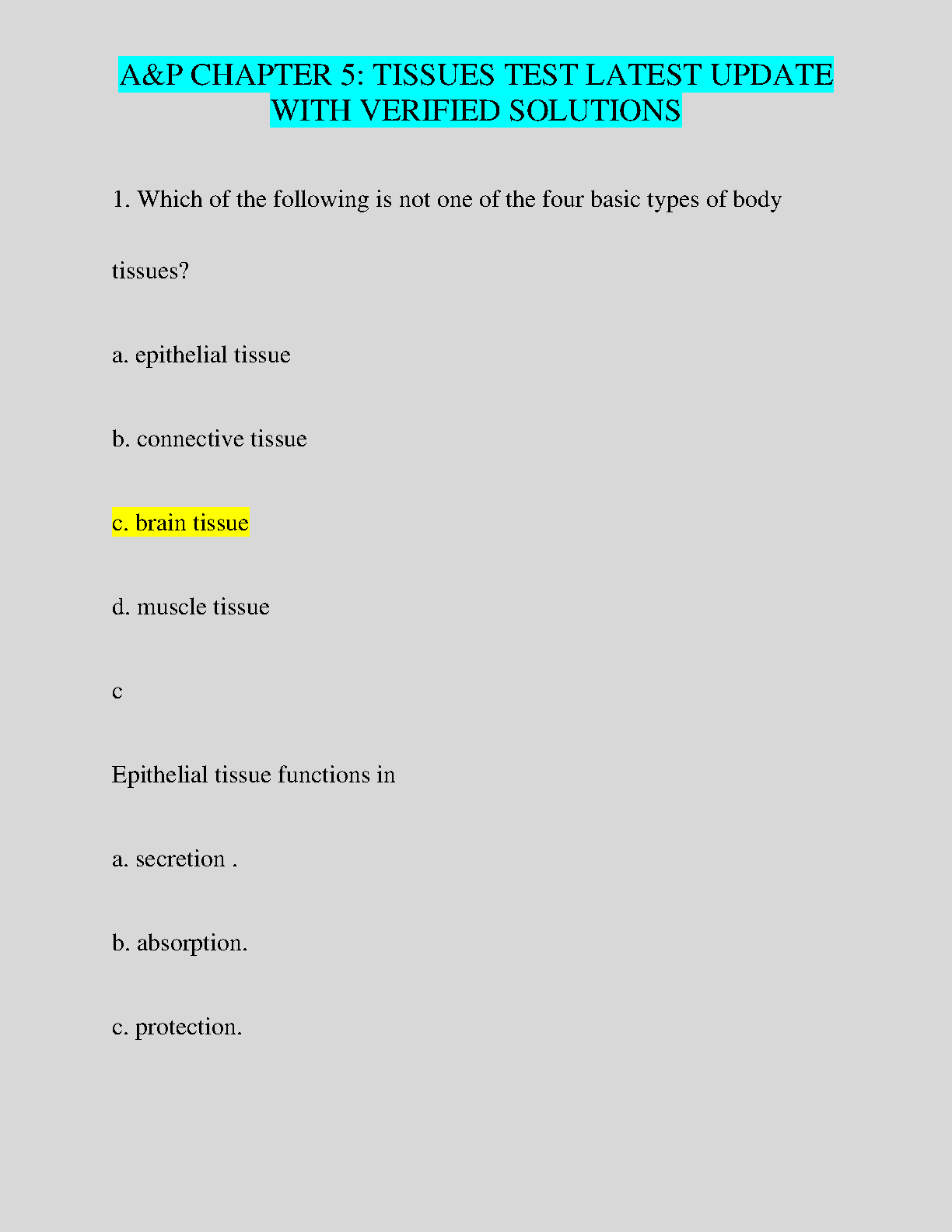 This comprehensive A&P Chapter 5 Tissues test contains verified solutions and is designed to help students achieve mastery of the subject. This resource is updated for the 2024/2025 academic year and covers all essential concepts to ensure a solid understanding of human tissues. Achieve academic success with this exam-focused resource and avoid resits.