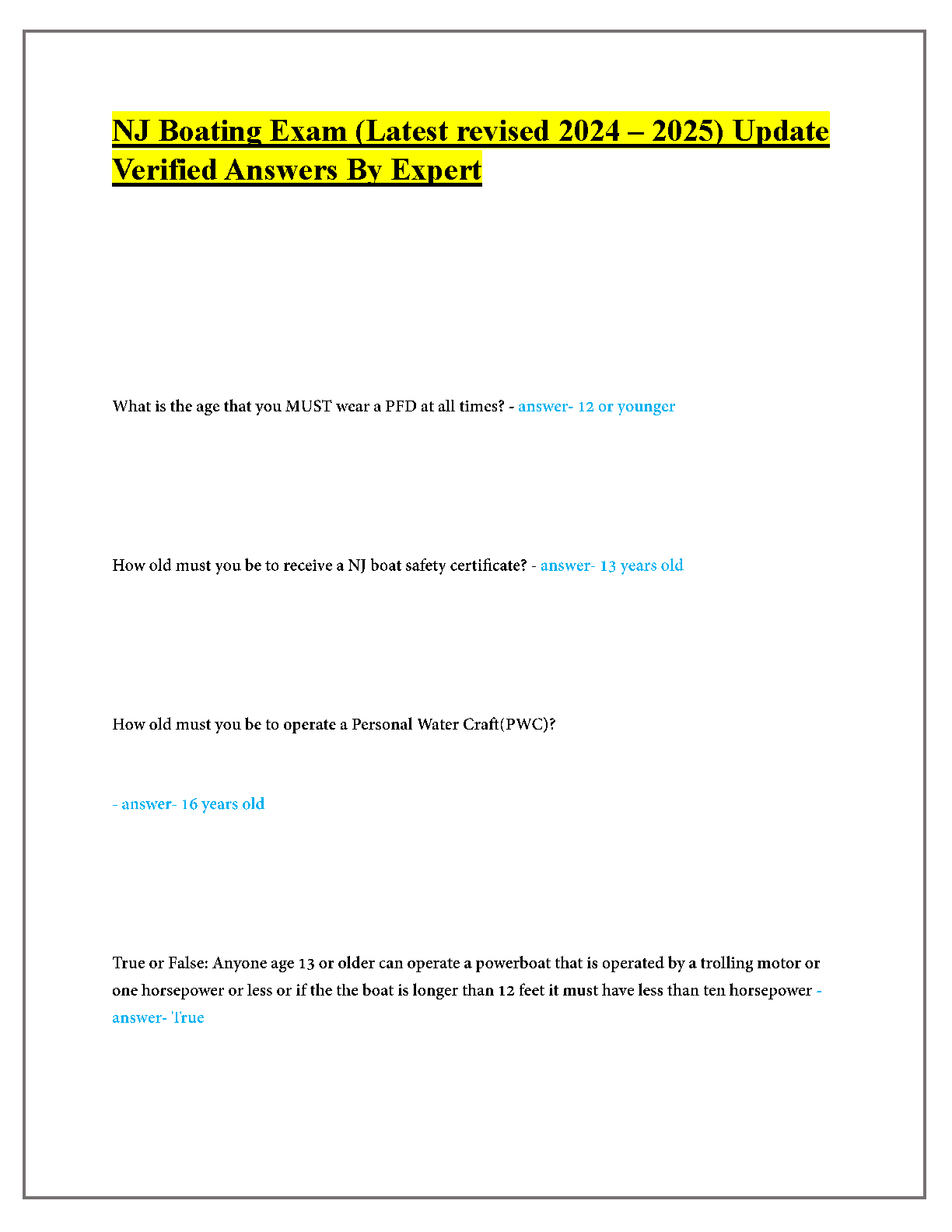 NJ Boating Exam (Latest Revised 2024-2025) Update: Verified Answers by Expert