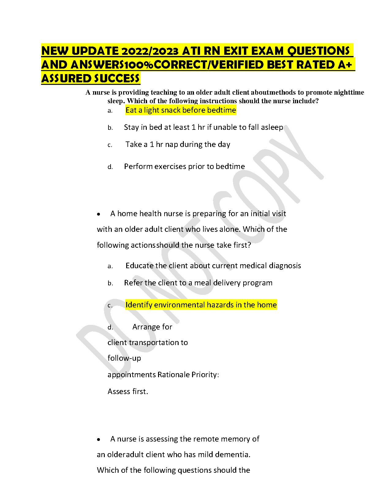 ATI RN Exit Exam Questions and Answers are 100% correct. This latest 2022/2023 update has verified answers to help you pass the exam and avoid resits. Get the best A+ rated and assured success on your first attempt