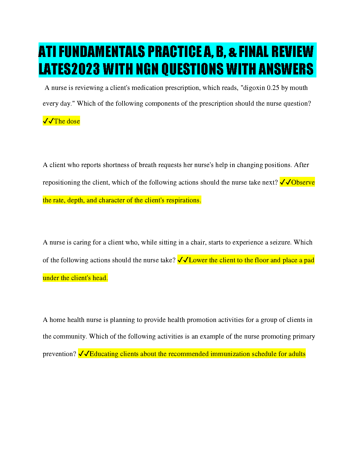 ATI Fundamentals Practice A, B, & Final Review Lates 2023 with NGN Questions with Answers by Linda Anne Silvestri, Mary Jo LeMone, Kathryn McCance
