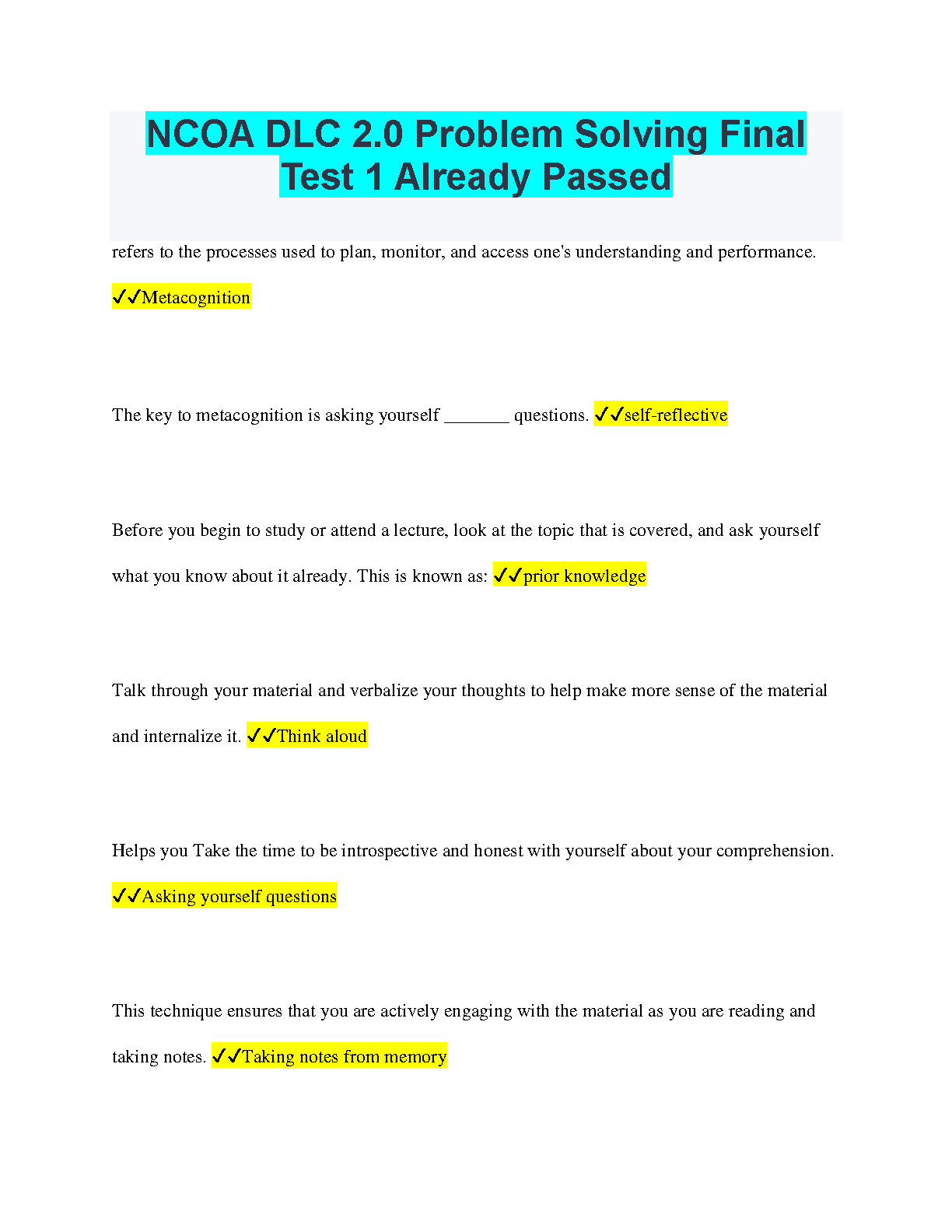 This study guide covers all the essential concepts and strategies needed to ace your NCOA DLC 2.0 Problem Solving Final Test 1. This guide offers a comprehensive approach with detailed explanations, practice exercises, and helpful tips to ensure your success on the first attempt.