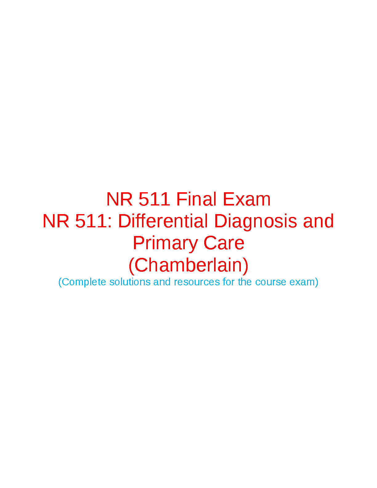 Ace your NR 511 final exam with this comprehensive solution manual. Get access to complete solutions and resources, ensuring a thorough understanding of differential diagnosis and primary care. This study guide is tailored for Chamberlain College of Nursing students, offering valuable insights and practice questions to boost your confidence and maximize your chances of success.