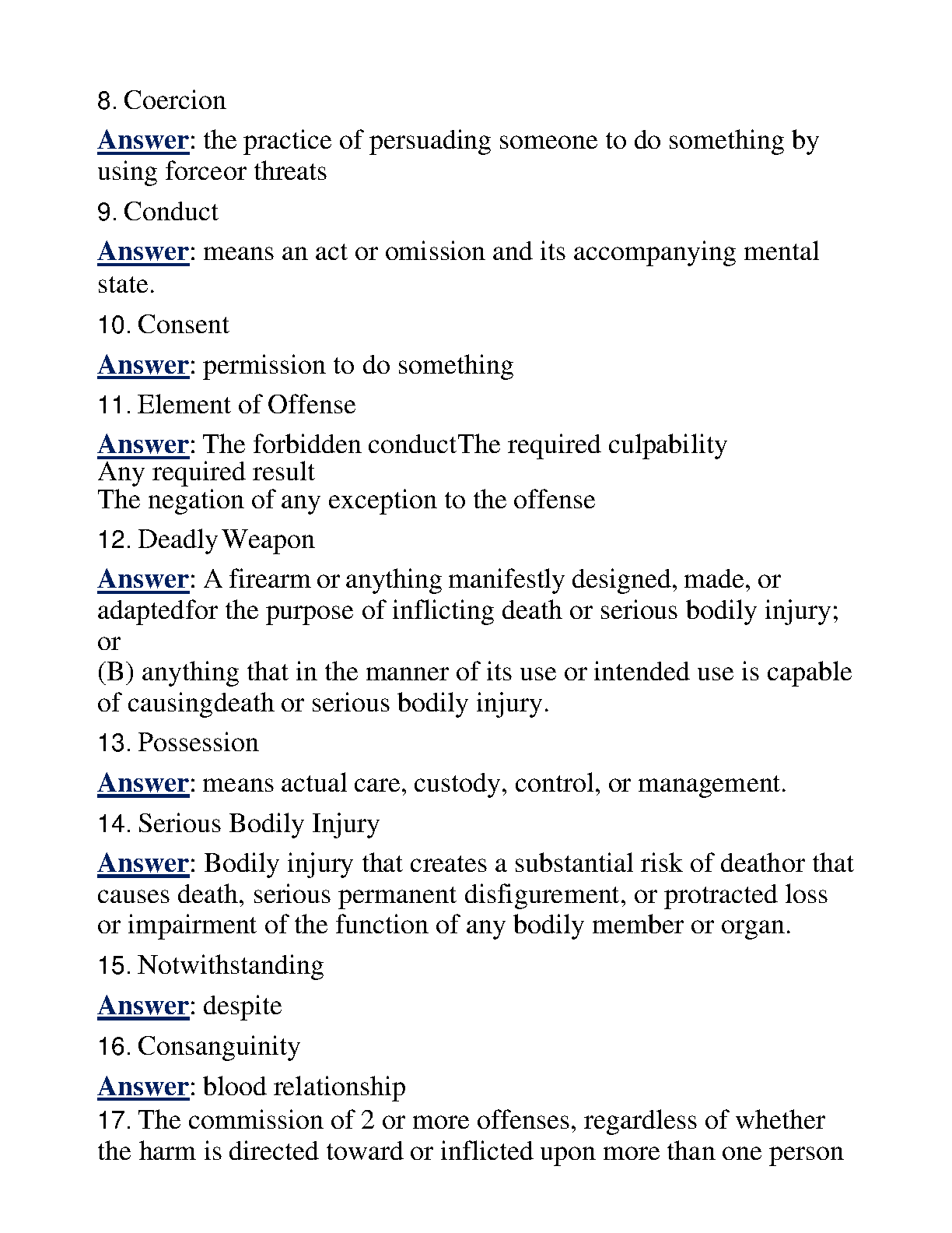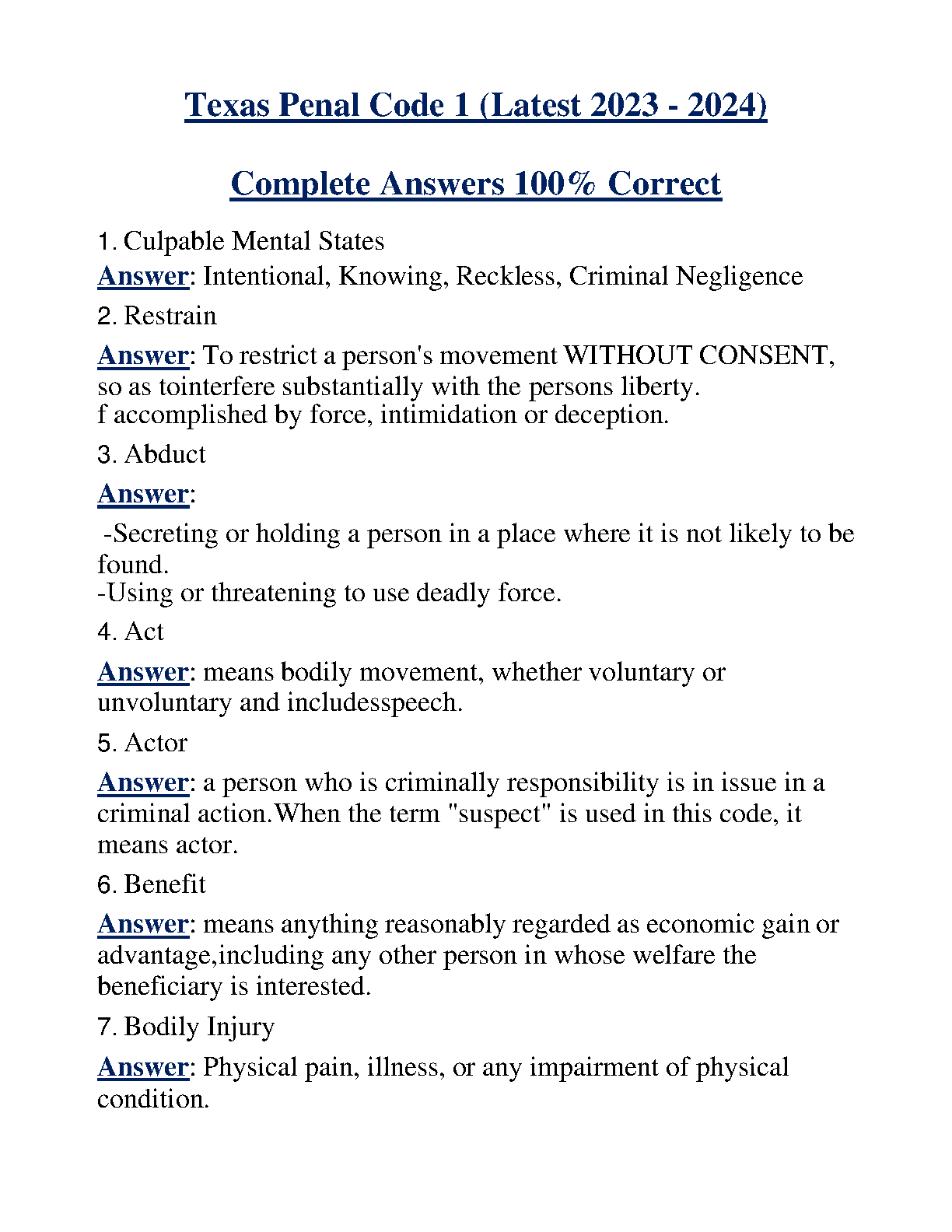 Ace your Texas Penal Code 1 exam with this comprehensive set of answers covering all key concepts and definitions. Gain a thorough understanding of criminal culpability, restraint, abduction, and more.
