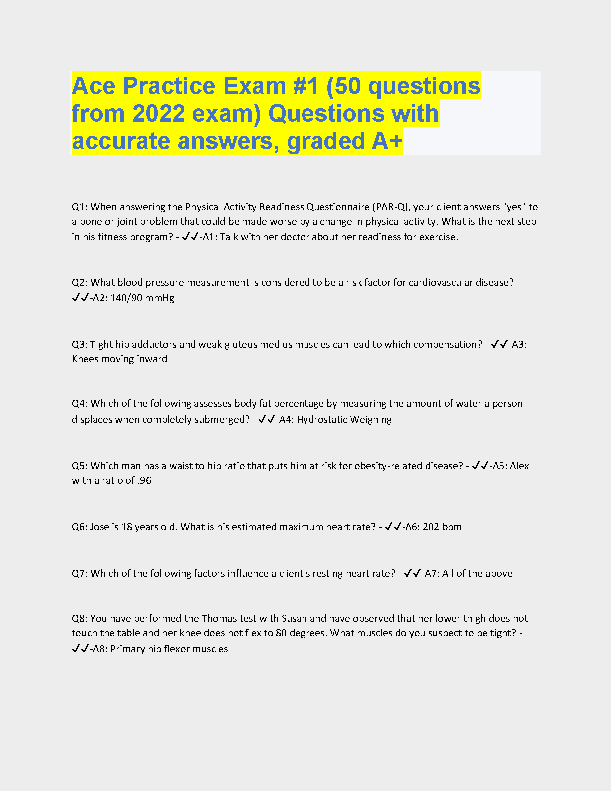 Ace Practice Exam #1 (50 questions from 2022 exam) Questions with accurate answers, graded A