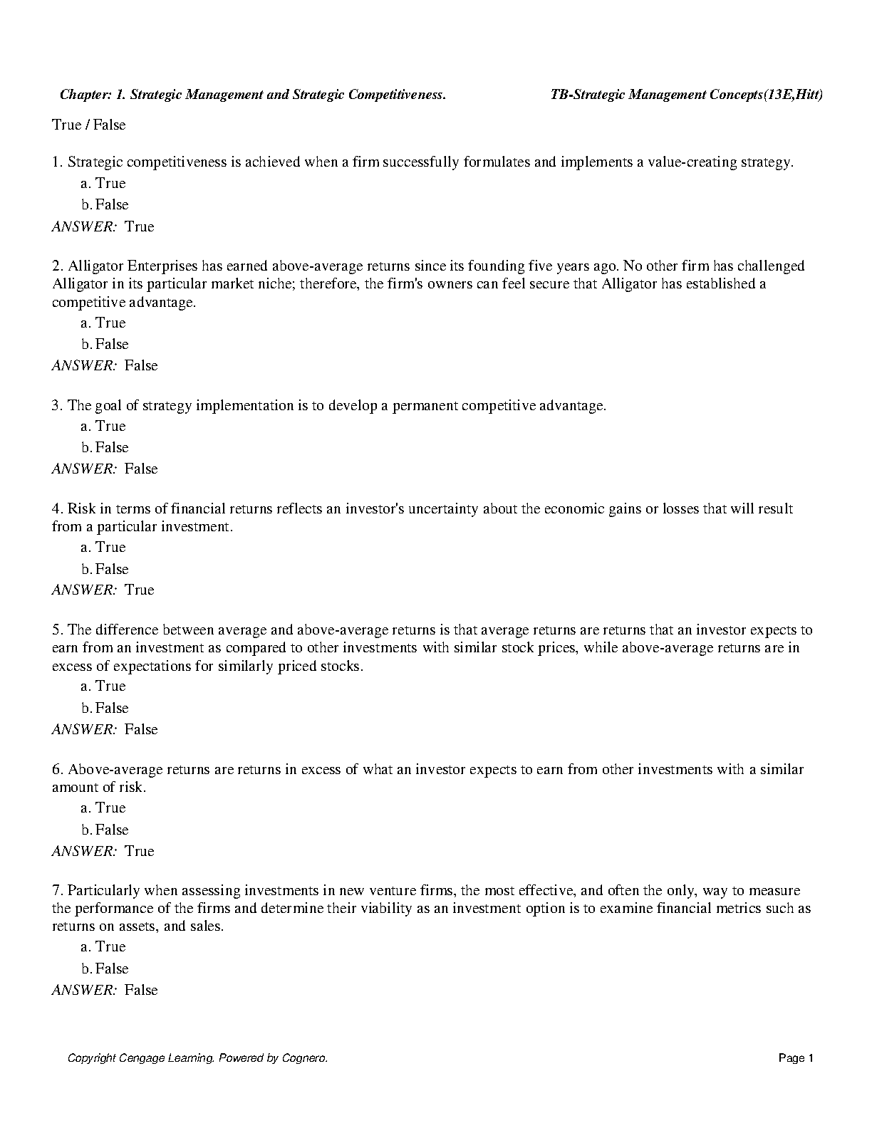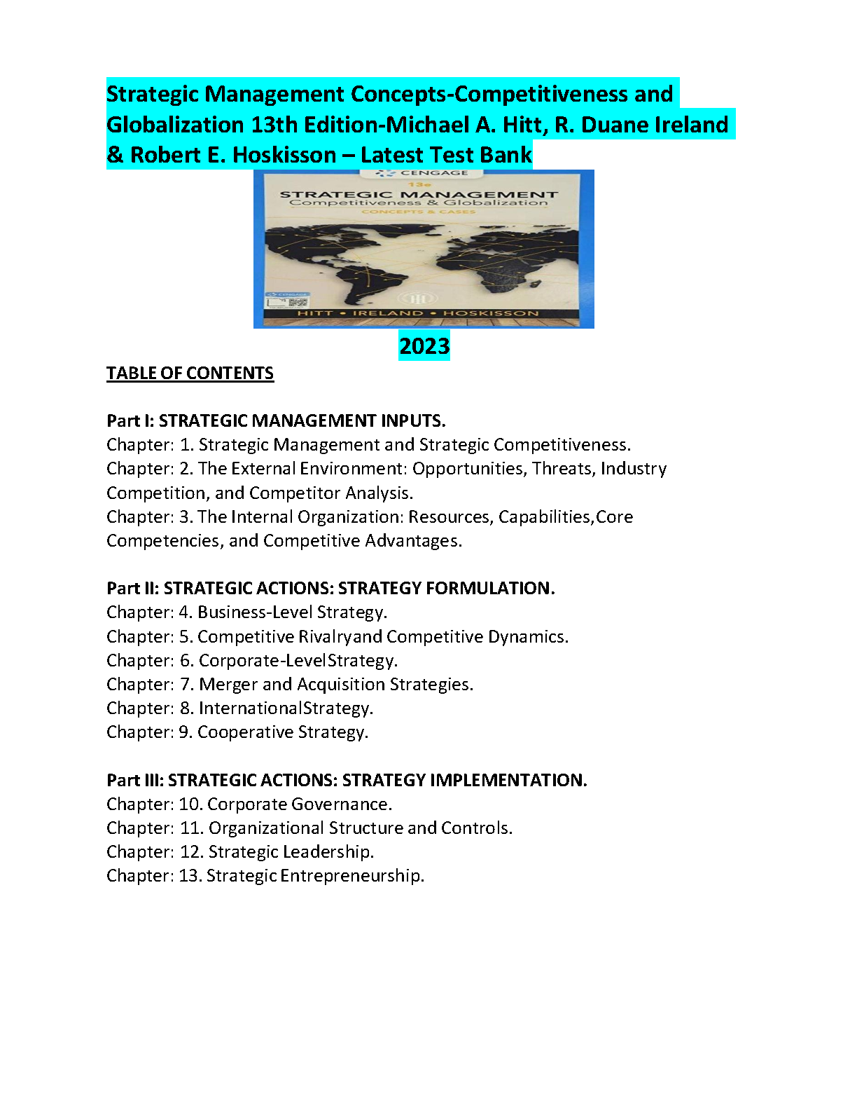Get the edge in your Strategic Management course with this comprehensive test bank for Strategic Management: Competitiveness and Globalization, 13th Edition by Michael A. Hitt, R. Duane Ireland, Robert E. Hoskisson. Designed to help you master the key concepts and principles of strategic management, this resource provides a wide range of practice questions and answers, covering all aspects of the textbook. Boost your understanding of competitive advantage, globalization, corporate strategy, and more. Ace your exams and achieve your academic goals with confidence.