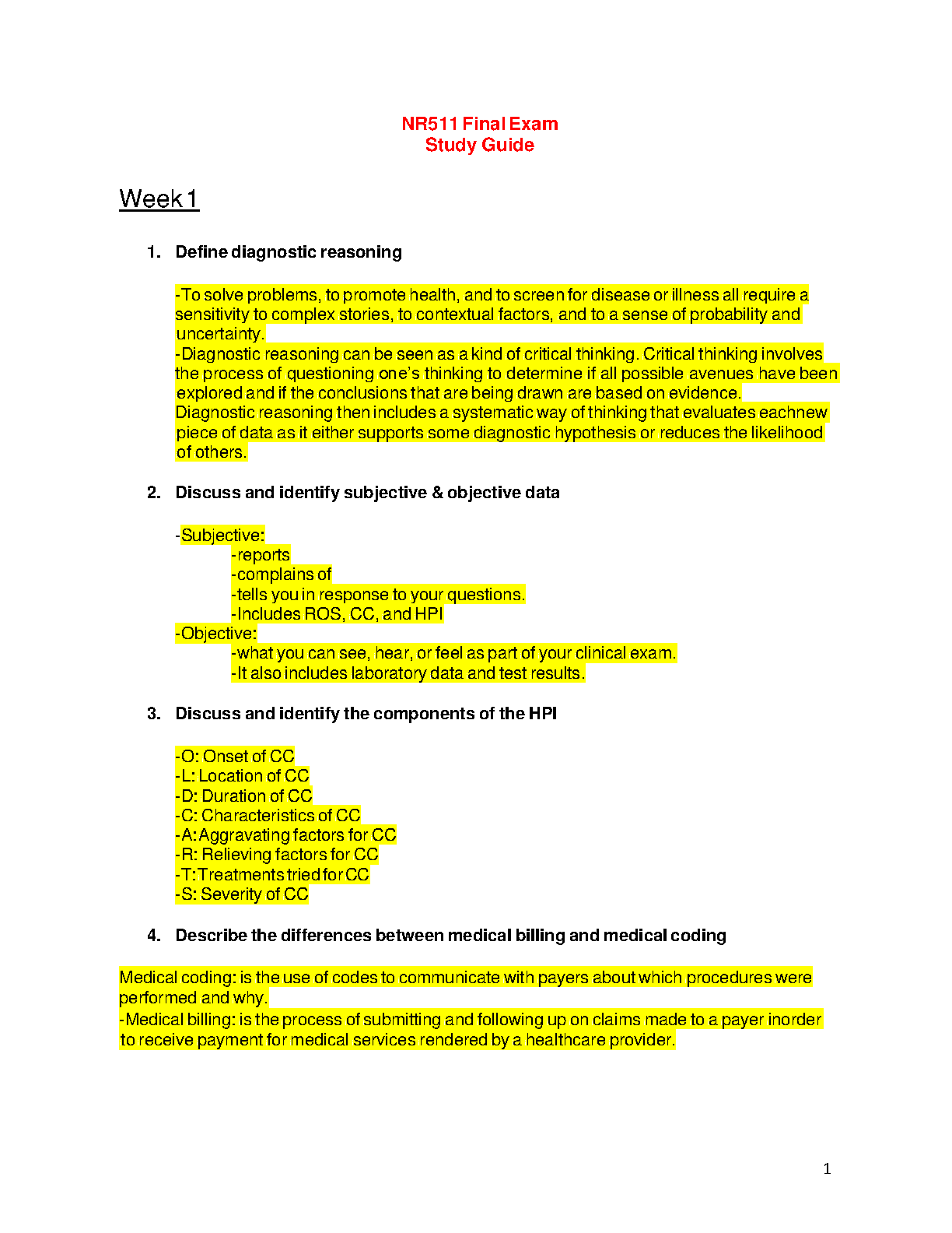 This comprehensive NR511 Final Exam Study Guide is tailored to help you succeed in your 2024/2025 nursing program. Packed with essential concepts and practice questions, this guide covers key topics like diagnostic reasoning, subjective and objective data, the HPI, and medical billing/coding. Get ready to ace your exam on the first attempt!