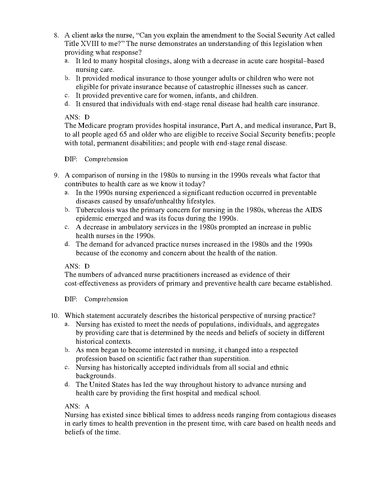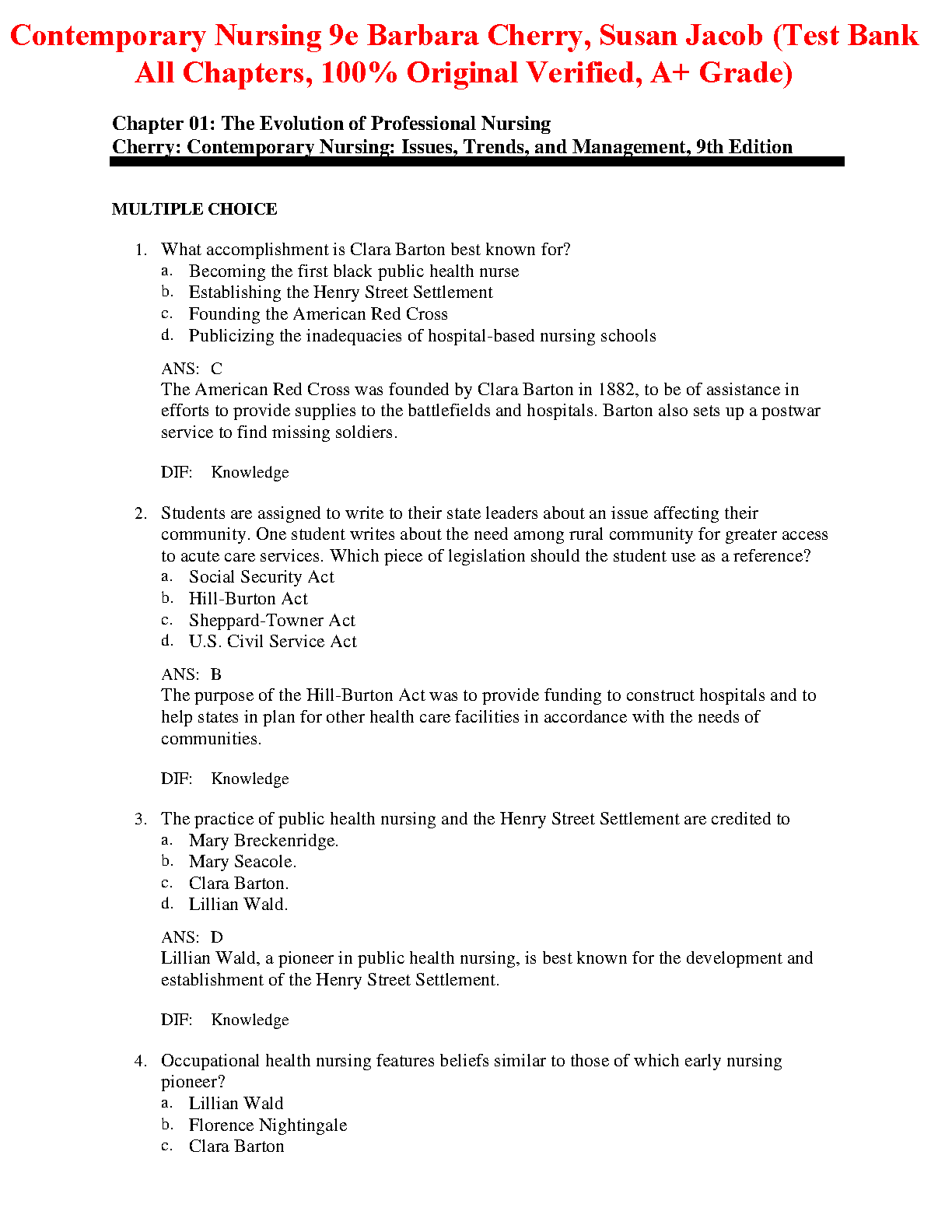 This comprehensive test bank covers all chapters of Contemporary Nursing: Issues, Trends, and Management, 9th Edition by Barbara Cherry and Susan Jacob. With 100% original content and verified answers, it provides a powerful tool to ensure success in your nursing coursework.