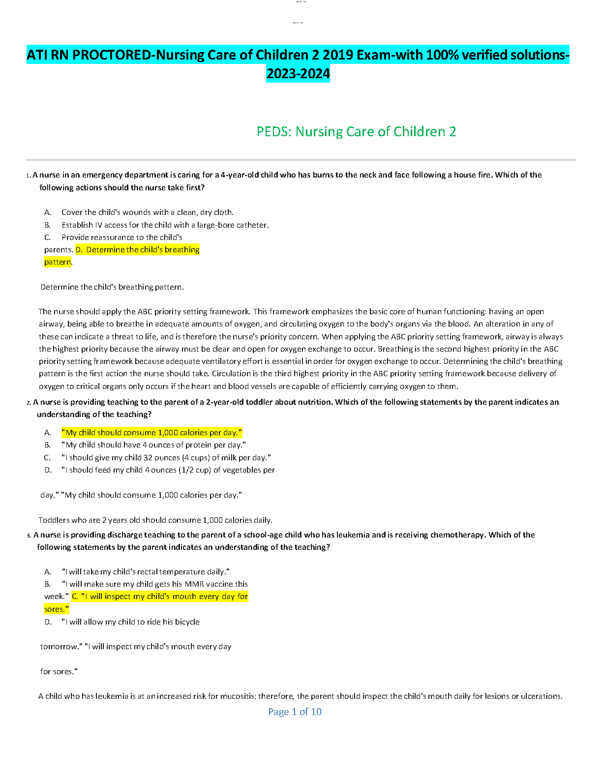 This resource contains 100% verified solutions to the ATI RN PROCTORED-Nursing Care of Children 2 2019 Exam, providing comprehensive coverage of essential concepts and practice scenarios. Perfect for students aiming to achieve a high score and confidently pass their nursing exams.
