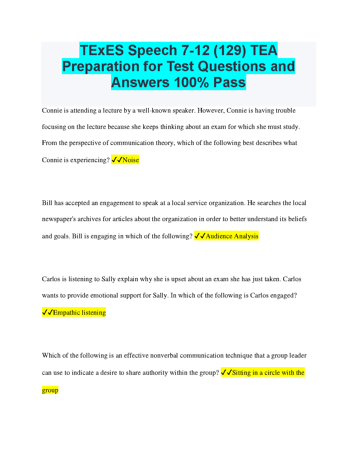 TEXES Speech 7-12 (129) TEA Preparation for Test Questions and Answers 100% Pass - Latest 2024/2025 Edition - Ace Your Exam on the First Attempt - by [Complete Authors' Names]