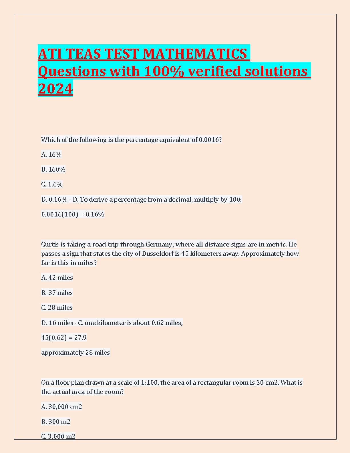 ATI TEAS Test Mathematics Questions with 100% Verified Solutions 2024/2025 Edition - Pass Your Exam on the First Attempt