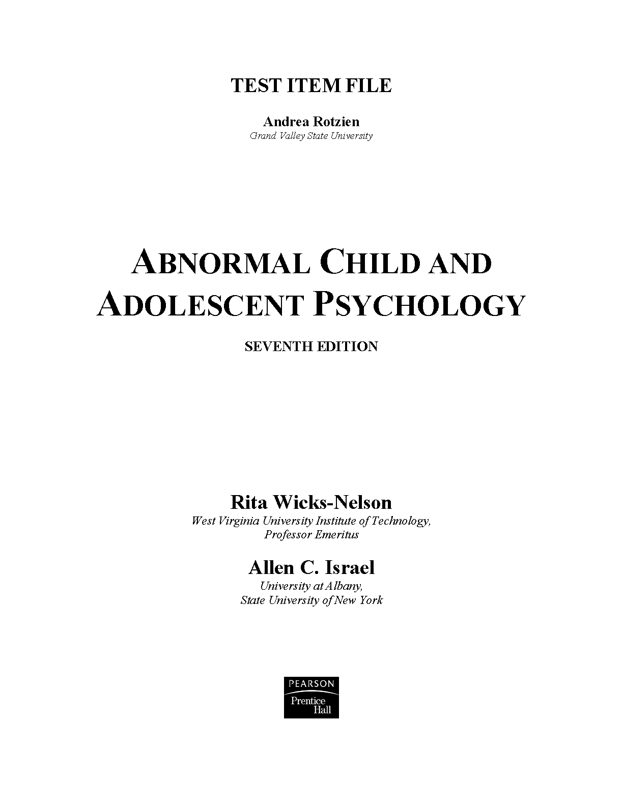 Abnormal Child and Adolescent Psychology 7th Edition Test Bank by Rita Wicks-Nelson and Allen C. Israel