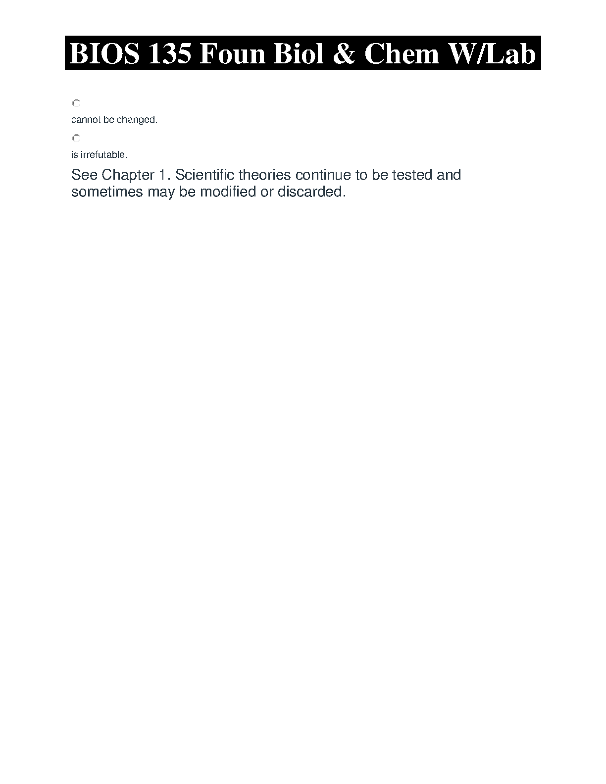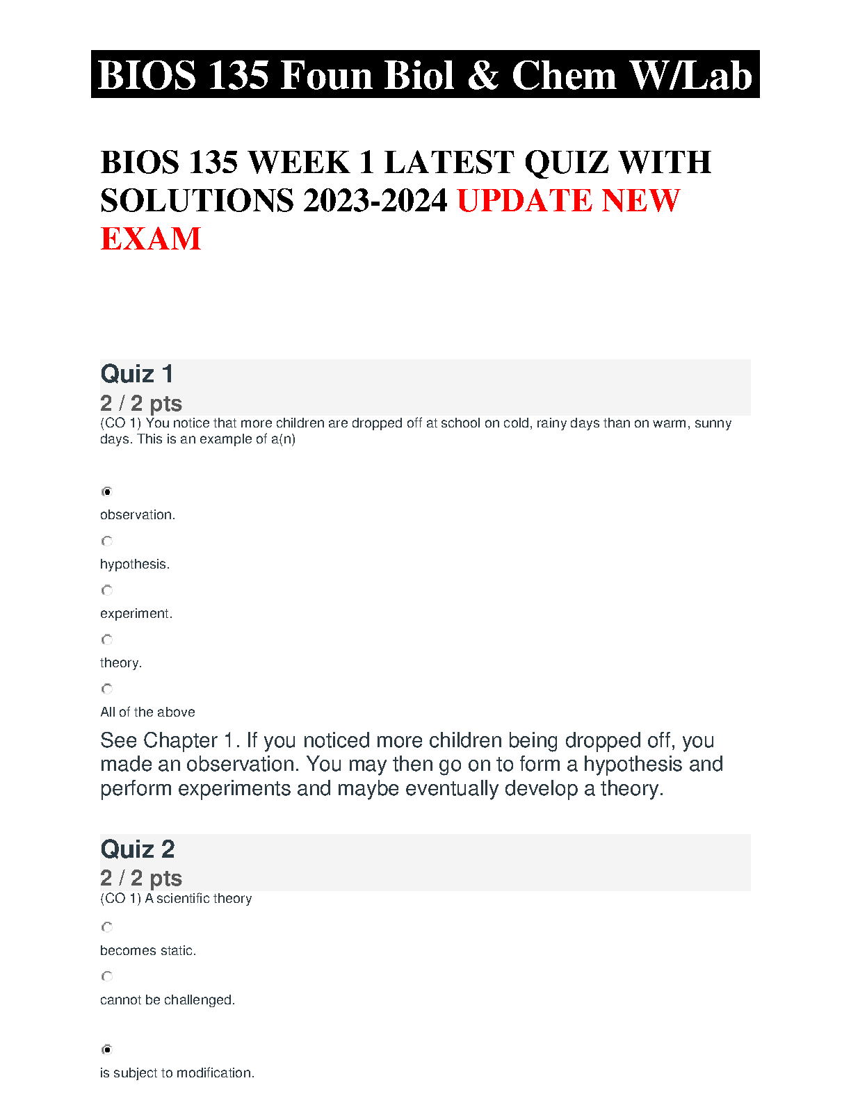 This resource contains the latest BIOS 135 quiz solutions for the 2023-2024 academic year, covering Week 1 content. The solutions are designed to help students pass their exams on the first attempt, avoiding the need for resits.