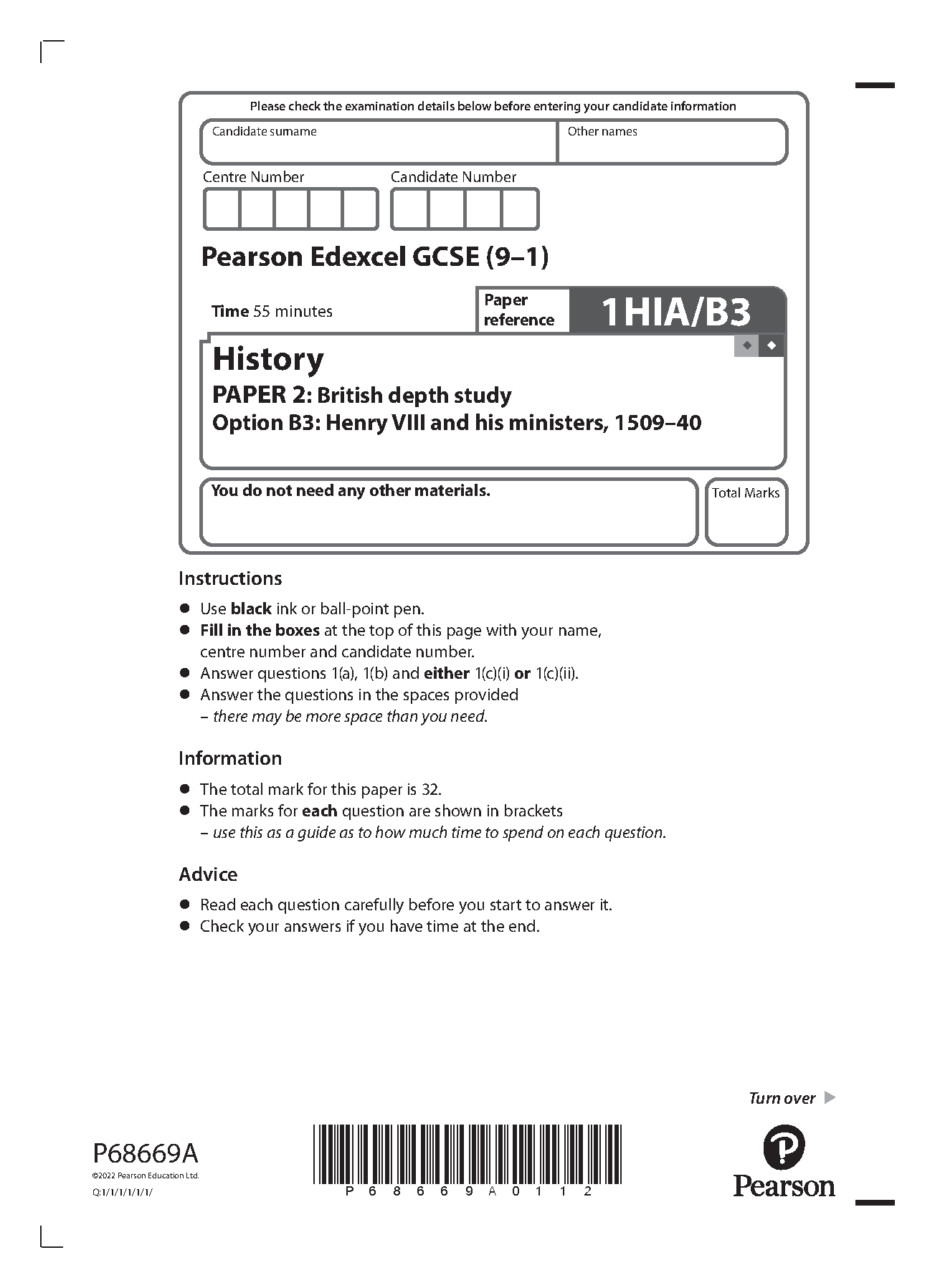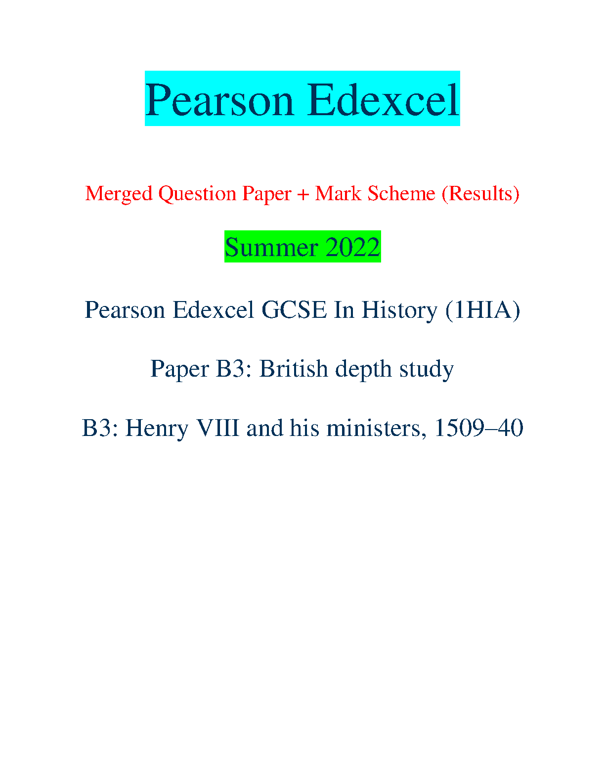 Pearson Edexcel GCSE in History (1HIA) - Summer 2022 - Paper B3: British Depth Study - Henry VIII and His Ministers, 1509-40 - Question Paper + Mark Scheme