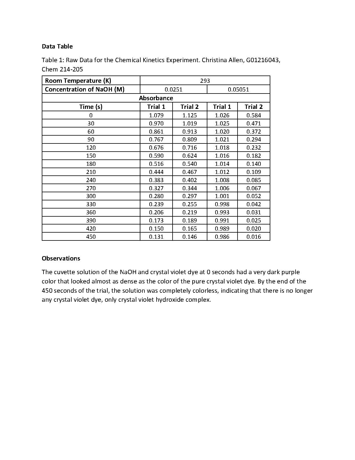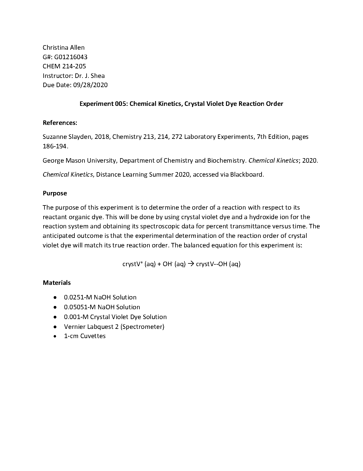 Chemistry 213, 214, 272 Laboratory Experiments, 7th Edition by Suzanne Slayden: Chemical Kinetics, Crystal Violet Dye Reaction Order Experiment