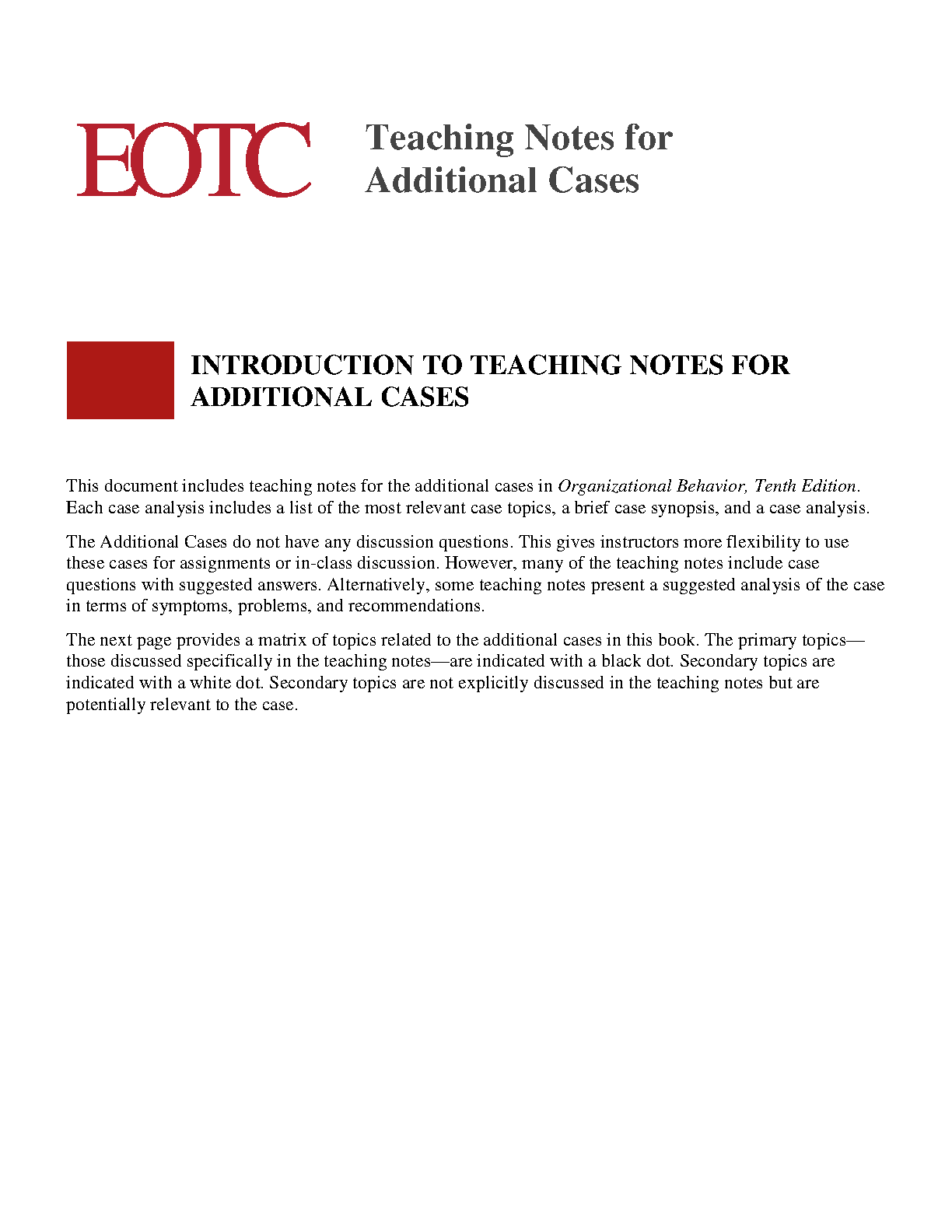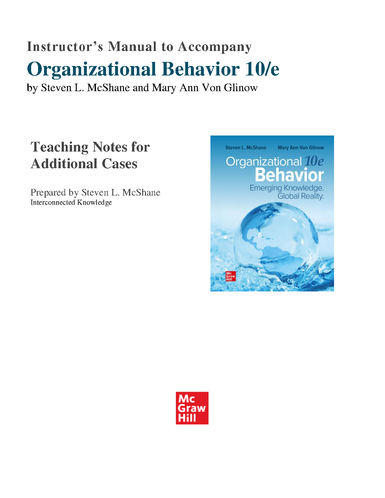 Organizational Behavior 10e by Steven L. McShane & Mary Ann Von Glinow - Instructor's Manual with Additional Cases